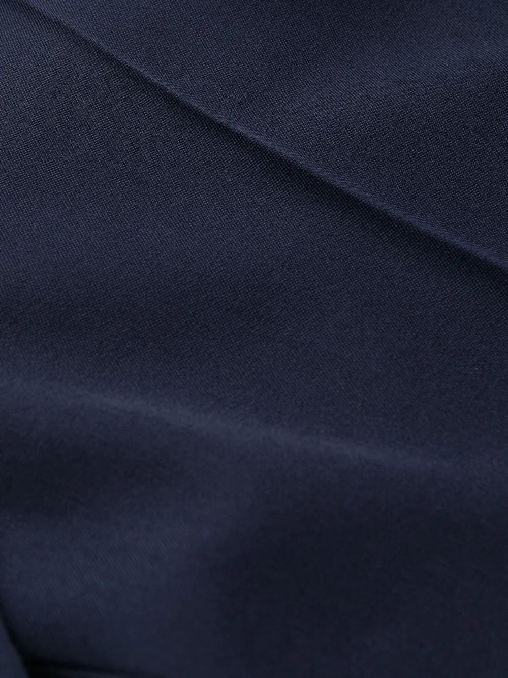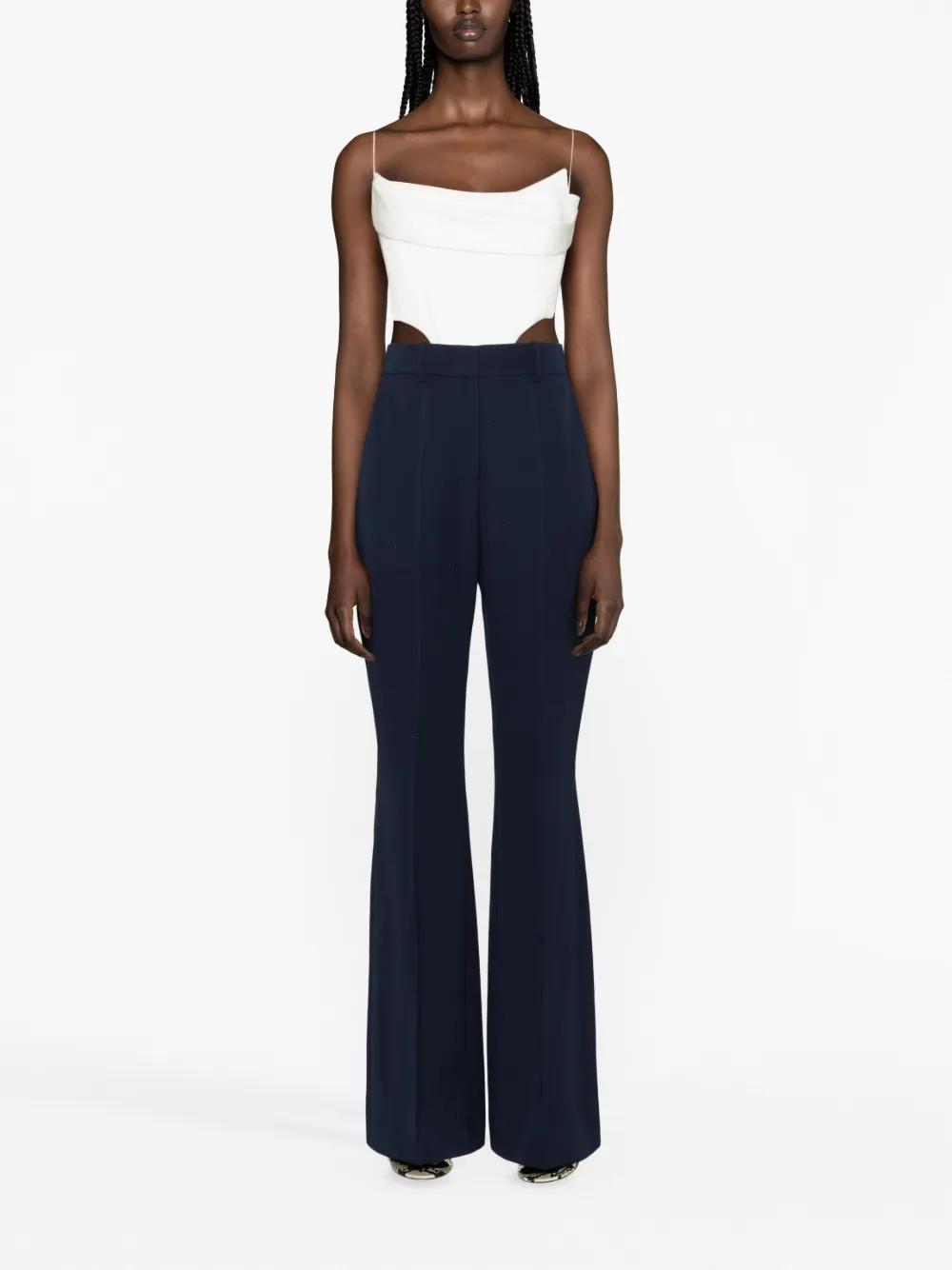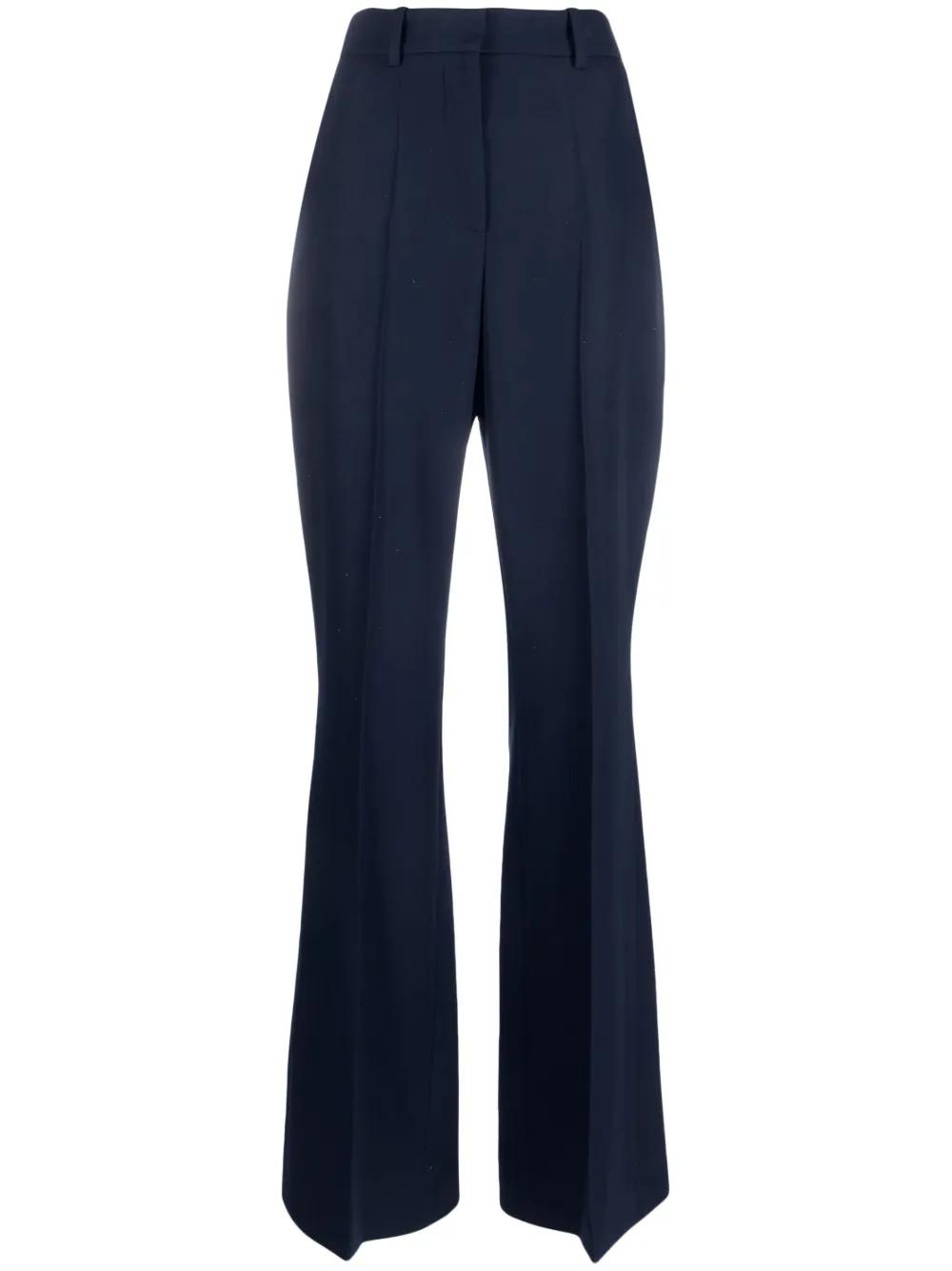 navy blue virgin wool high waist belt loops hook and zip fly fastening two side slash pockets pressed crease flared design unlined