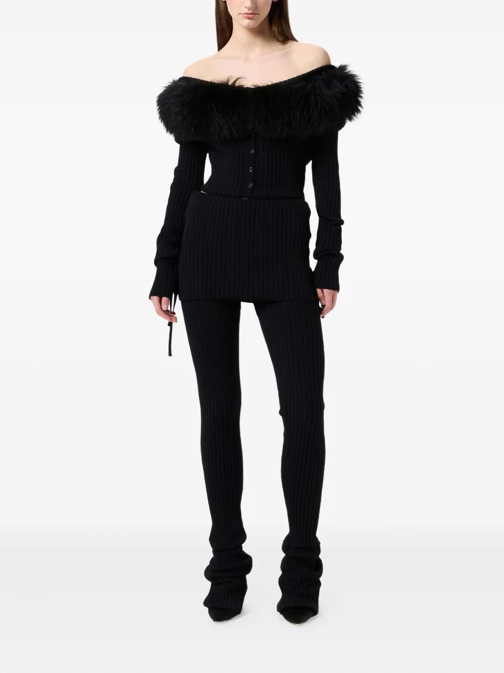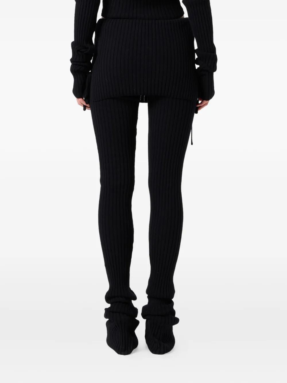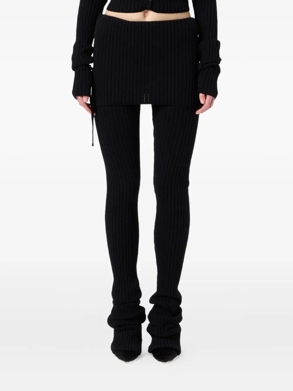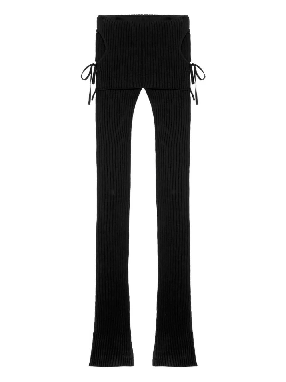 black ribbed knit attached mini-skirt tie fastenings sides ankle ruffles