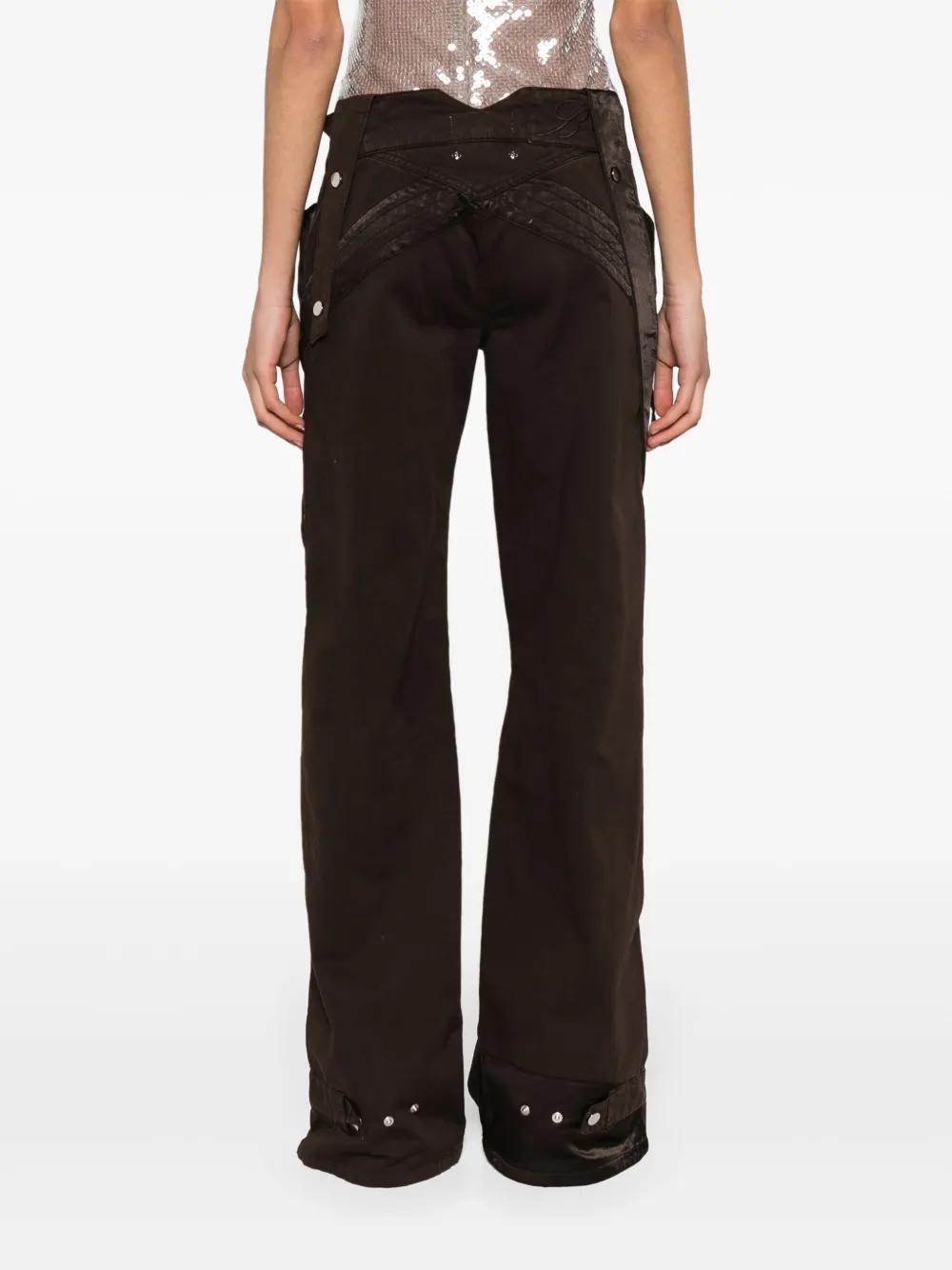 chocolate brown cotton twill weave panelled design logo-engraved silver-tone hardware embroidered logo to the rear detachable belt loops low-rise straight leg two front patch pockets front zip-fastening pocket zip fly fastening front button fastening unlined