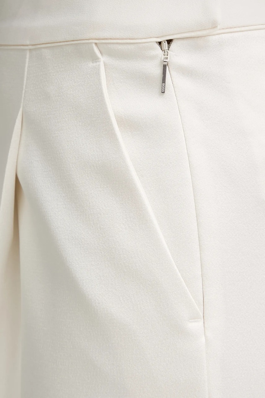 - Prosty, nie blokujący ruchów fason. - Nogawka zaprasowana w kantkę. - Ozdobne zakładki. - Model z podwyższoną talią i zapięciem na suwak i haftkę. - Wsuwane kieszenie. - Model wykonany z materiału o satynowym splocie. - Cienka, nieelastyczna tkanina. - Szerokość w pasie: 38 cm. - Szerokość w biodrach: 58 cm. - Wysokość stanu: 31 cm. - Szerokość nogawki na dole: 18,5 cm. - Szerokość nogawki: 33 cm. - Długość wewnętrzna nogawki: 72 cm. - Wymiary podane dla rozmiaru: 36.