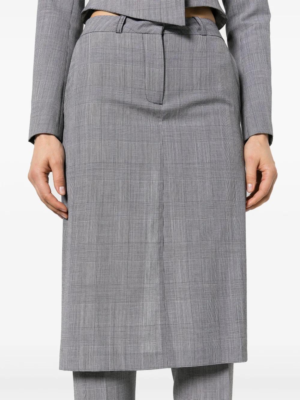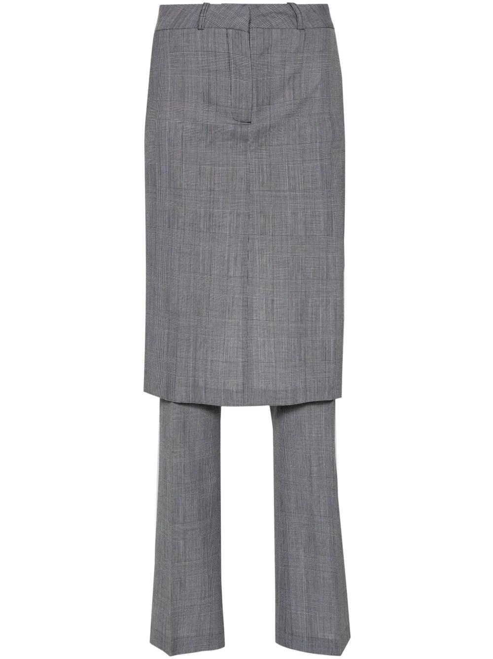 black/white virgin wool check pattern layered design pressed crease belt loops two diagonal pockets to the sides straight leg front hook and zip fly fastening