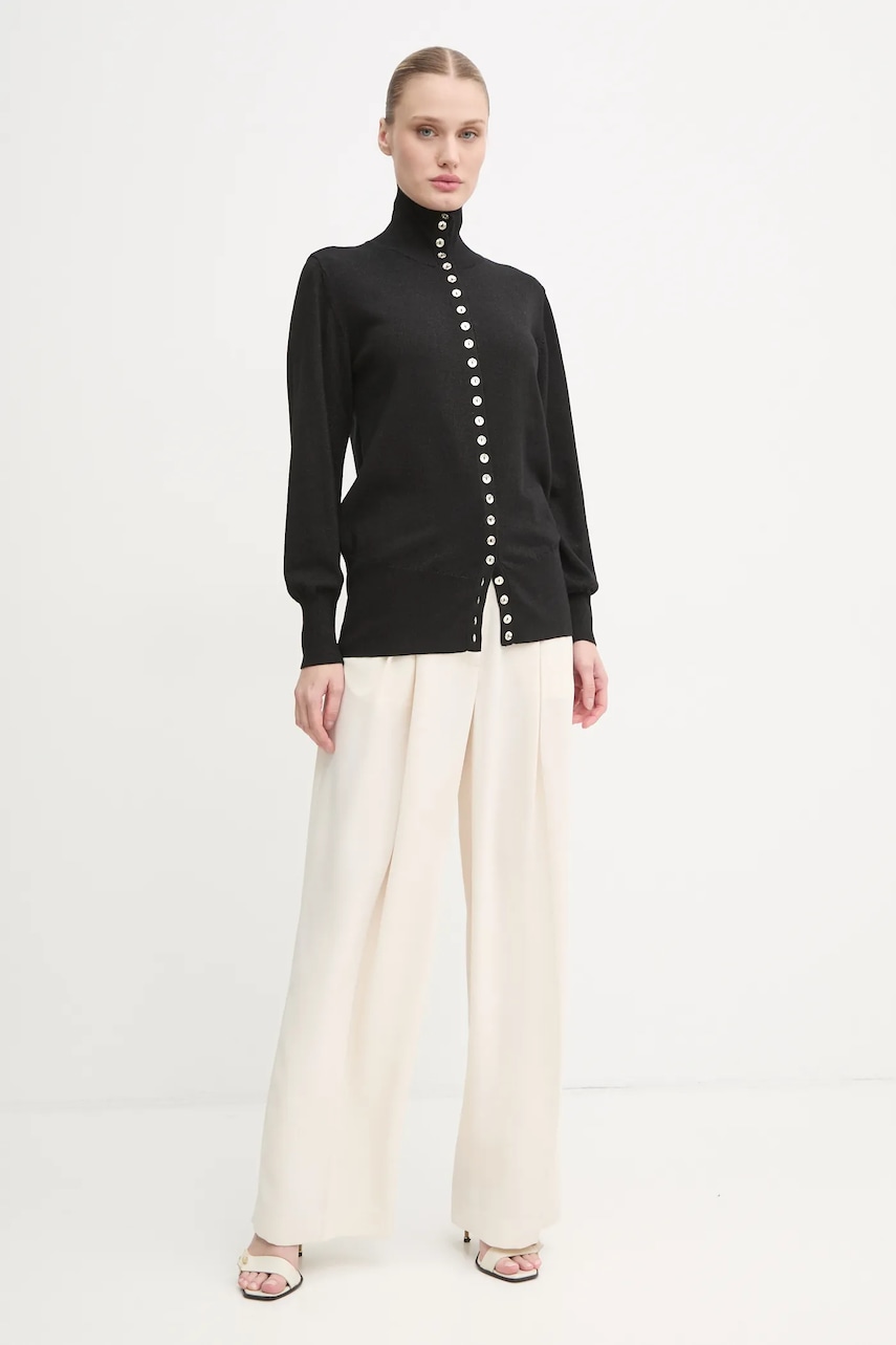- Model z podwyższoną talią i zapięciem na suwak i haftki. - Z przodu dwie wsuwane kieszenie. - Prosta nogawka na całej długości. - Nogawka zaprasowana w kantkę. - Cienka, nieelastyczna tkanina. - Kieszeń na pośladku zapinana na guzik. - Szerokość w pasie: 40 cm. - Szerokość w biodrach: 51 cm. - Szerokość nogawki na dole: 27 cm. - Wysokość stanu: 30 cm. - Szerokość nogawki: 35 cm. - Długość zewnętrzna nogawki: 110 cm. - Wymiary podane dla rozmiaru: 36.