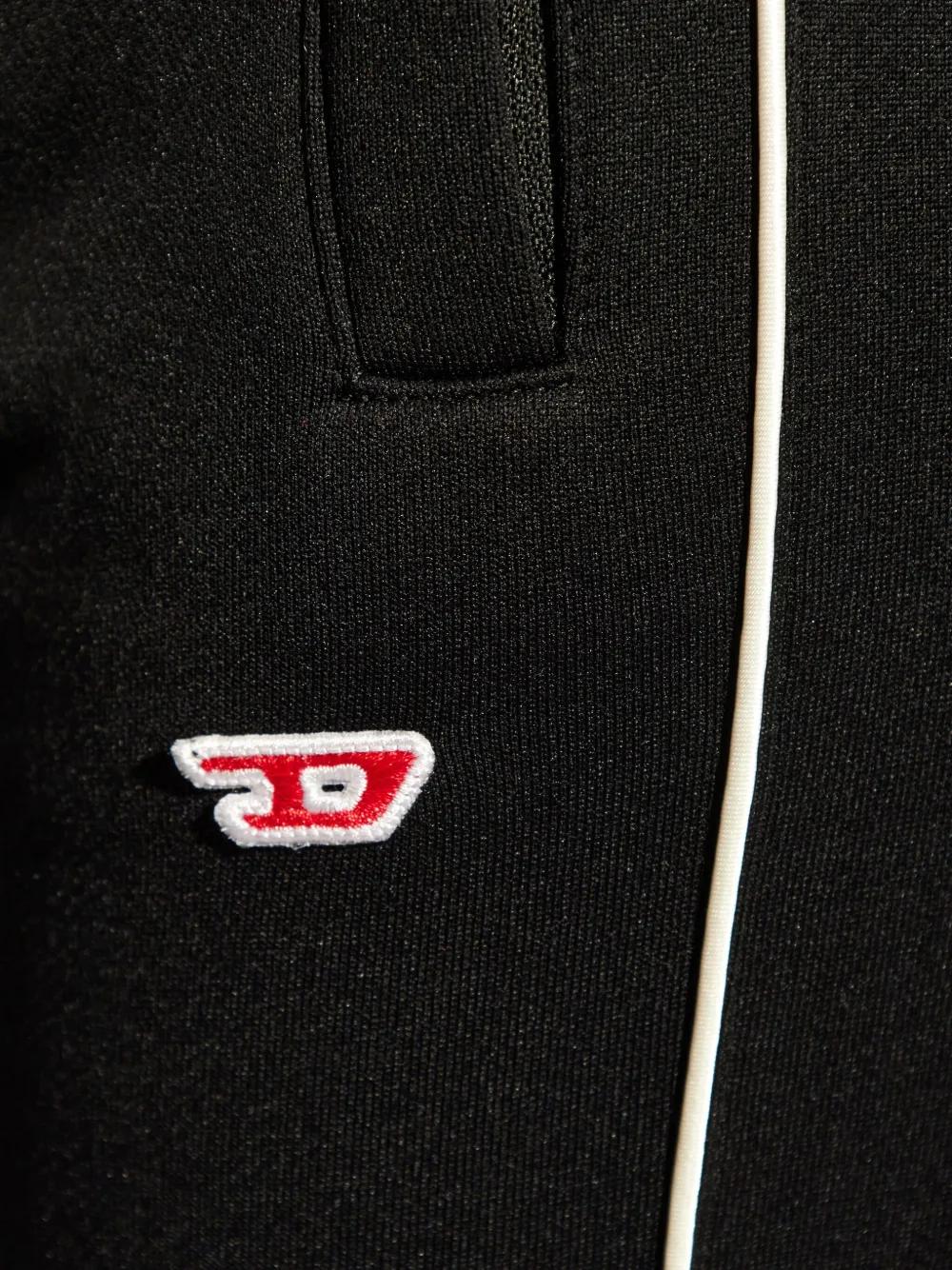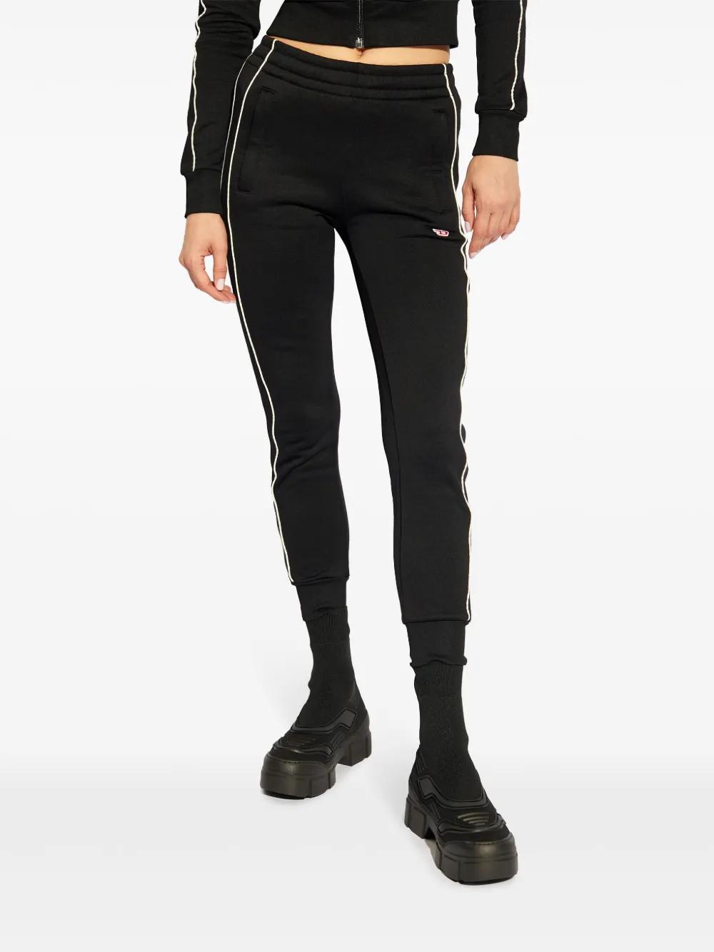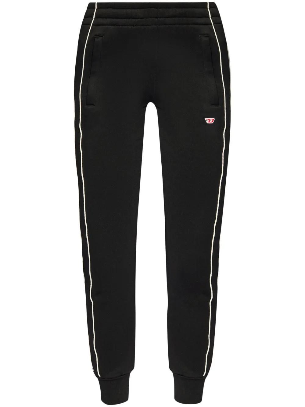 black cotton blend logo patch to the front piped-trim detailing elasticated waistband two side slit pockets cropped leg