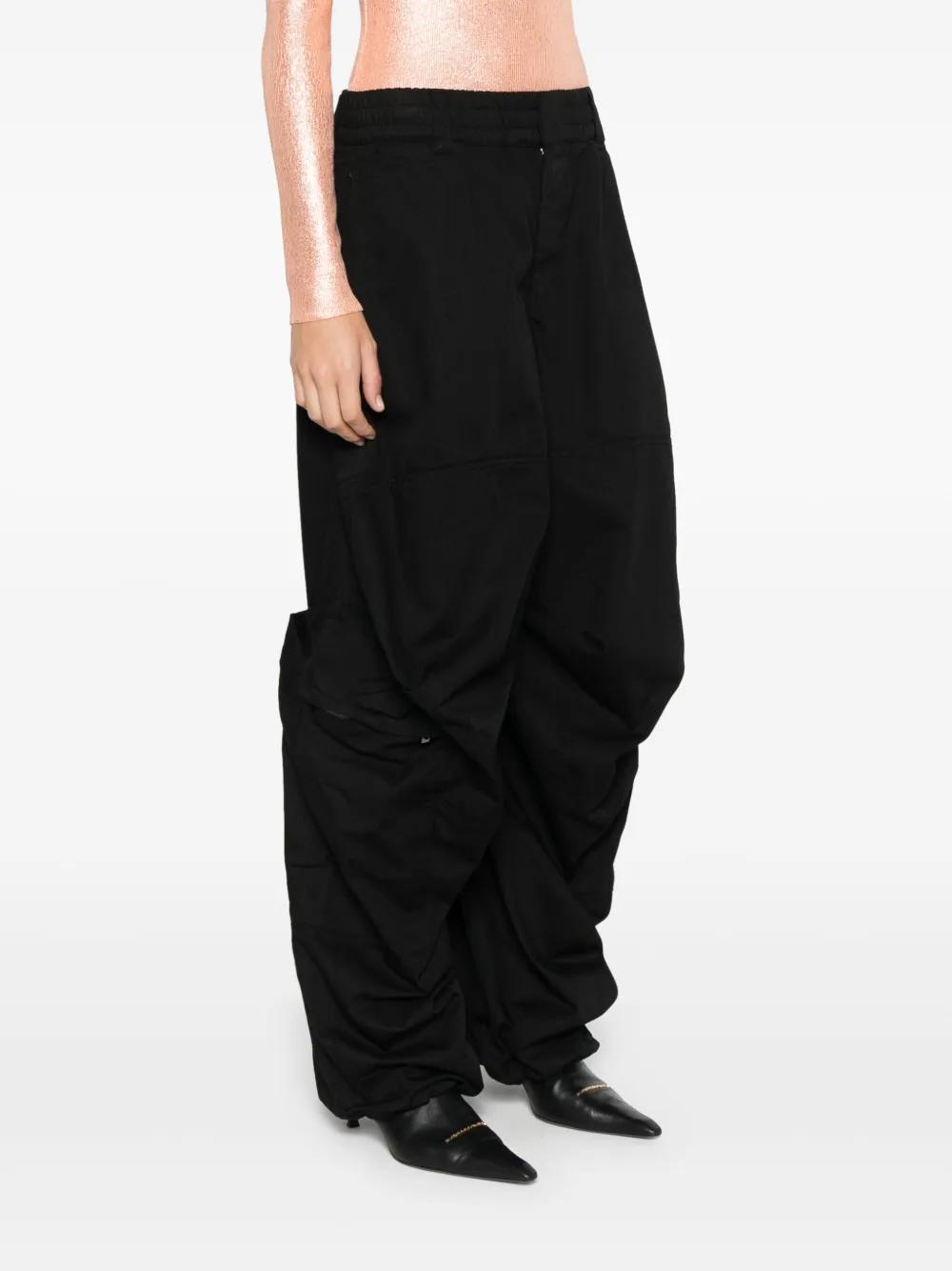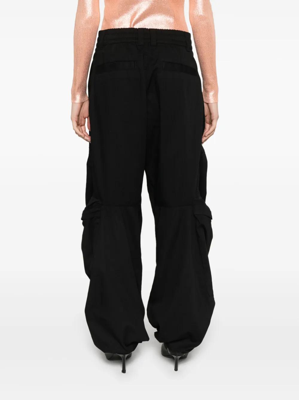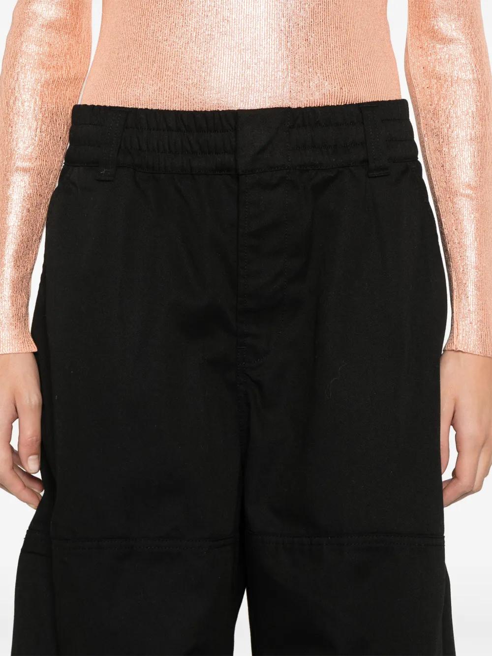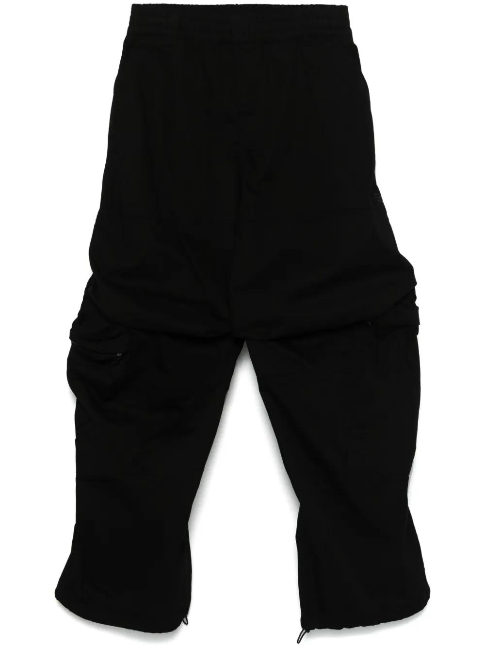 black twill weave concealed front button, hook and zip fastening elasticated waistband with internal drawstring belt loops two side slash pockets tonal embroidered logo at the leg two side zip-fastening pockets two rear welt pockets drawstring hem full-length