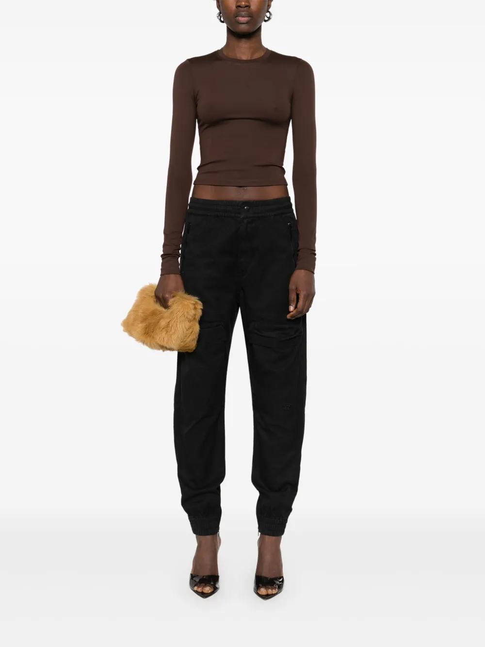 black front button and zip fastening elasticated waistband two side zip-fastening pockets two front cargo pockets