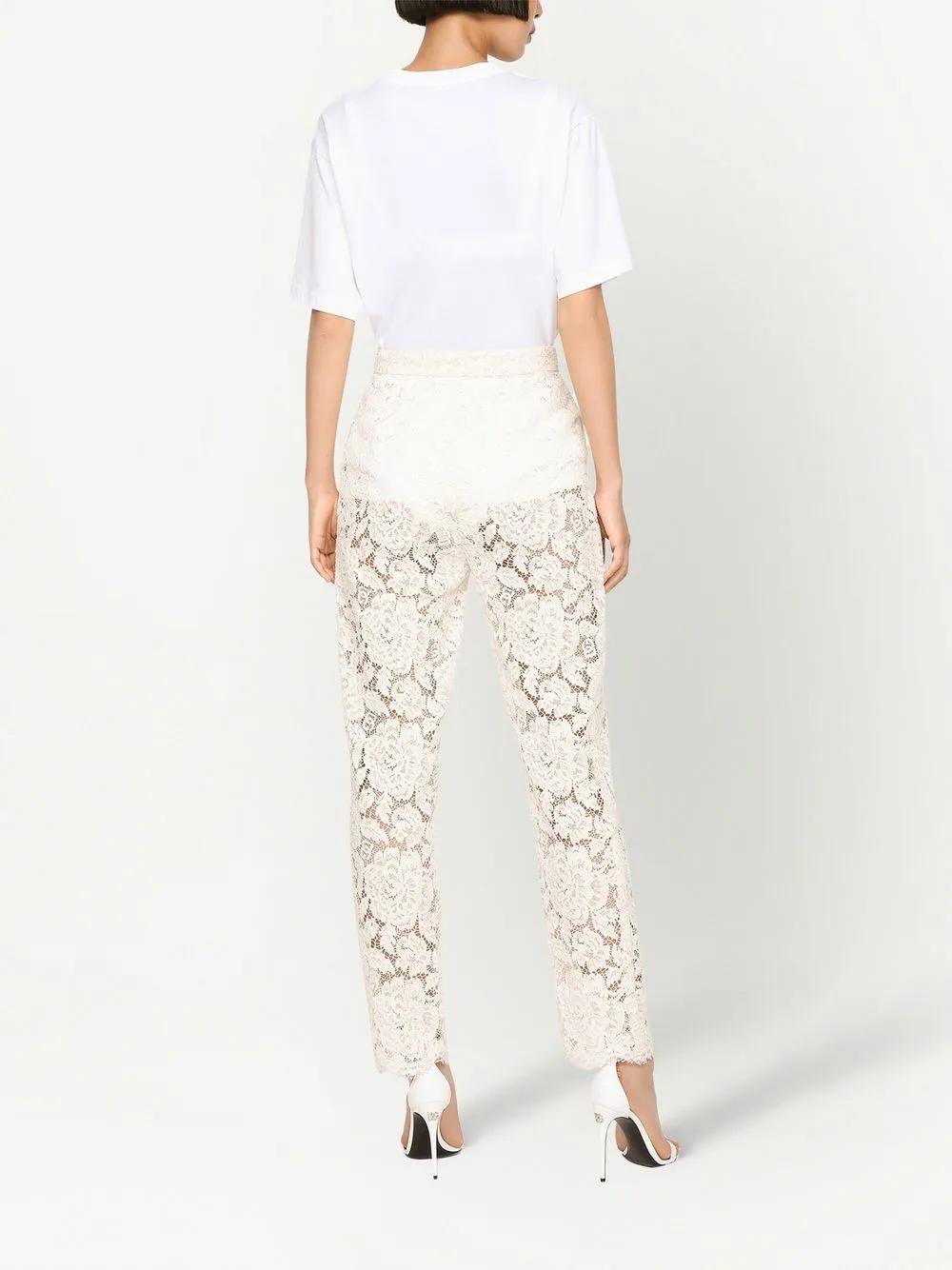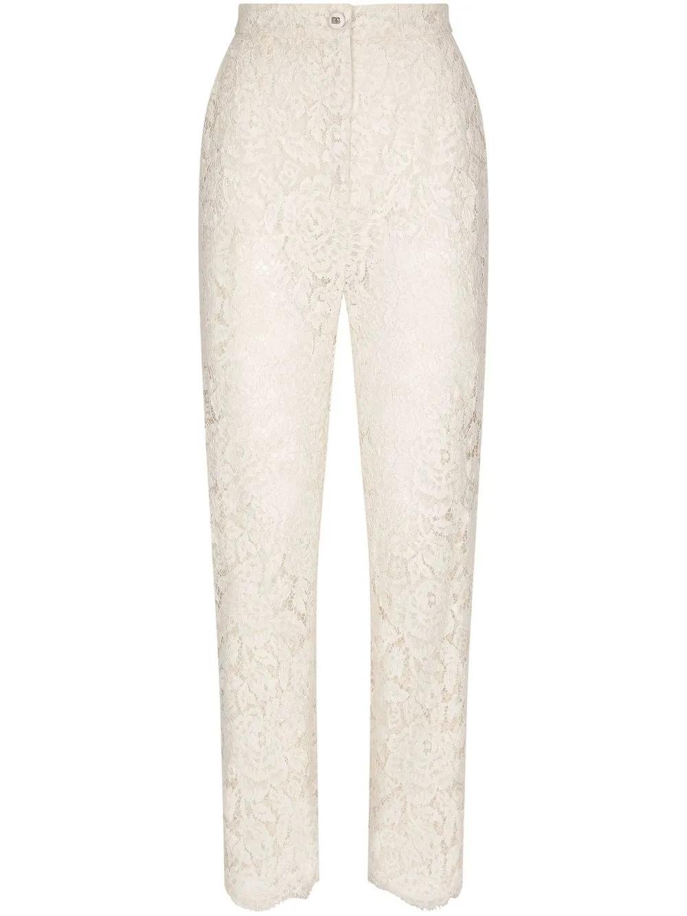 ivory white cotton blend floral-lace detailing semi-sheer construction button fly fastening logo-embossed buttons belt loops high-waisted ankle-length