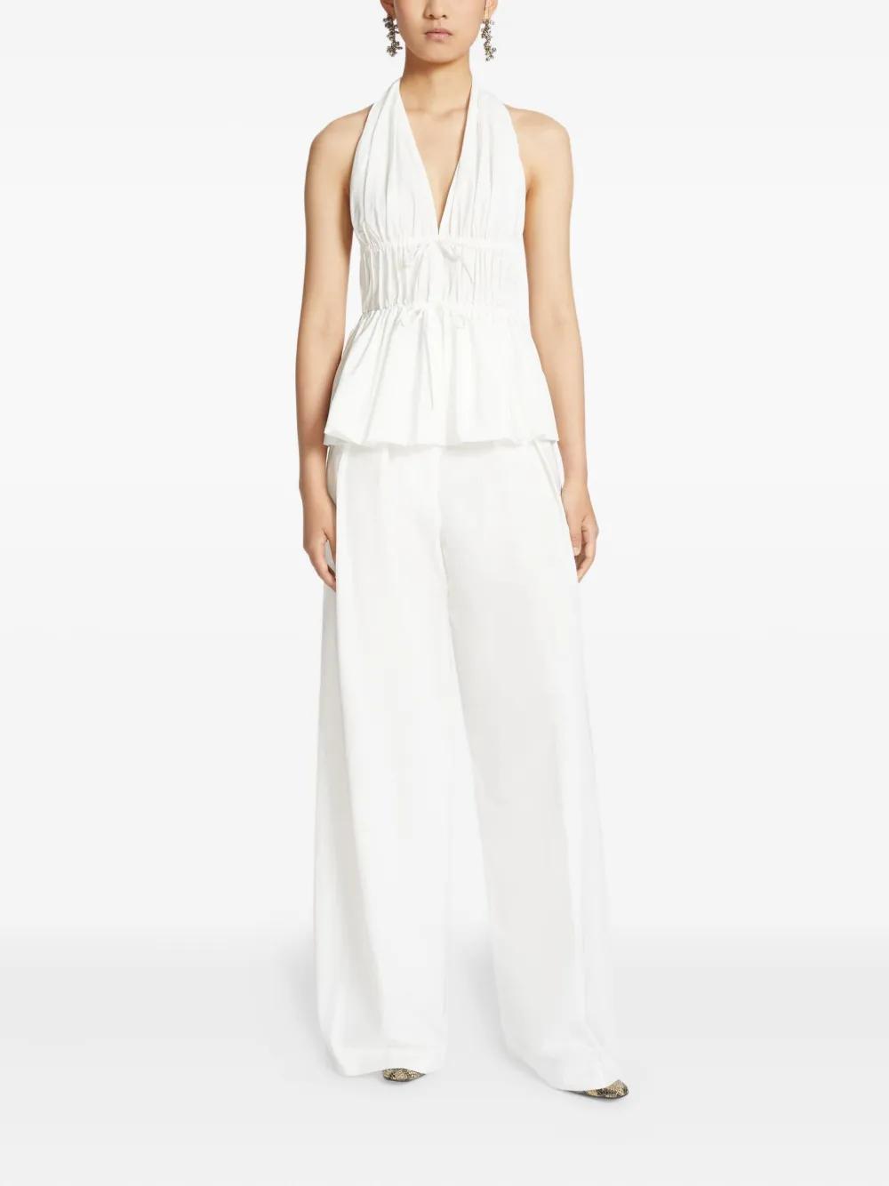 crisp white front pleats button detail side pockets tailored waistband flowing silhouette