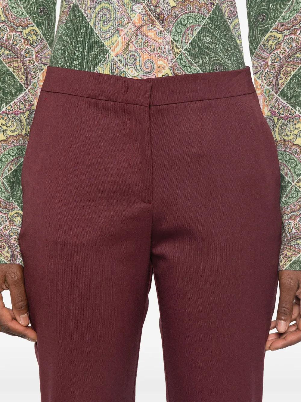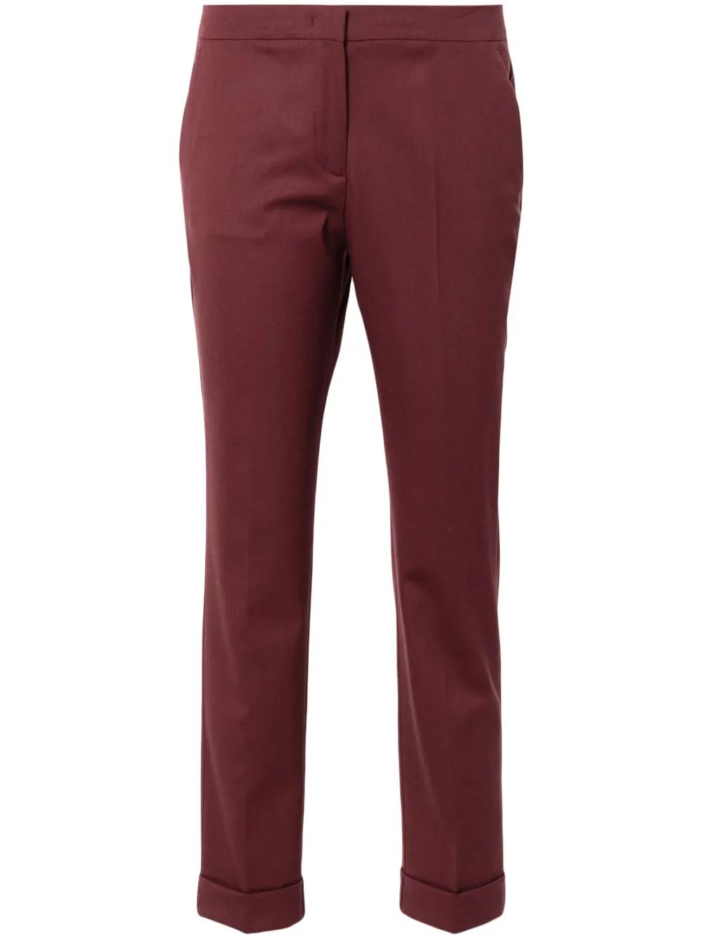 bordeaux red stretch-wool pressed crease two diagonal pockets to the sides two rear jetted pockets slim cut cropped leg turn-up hem concealed front button, hook and zip fastening