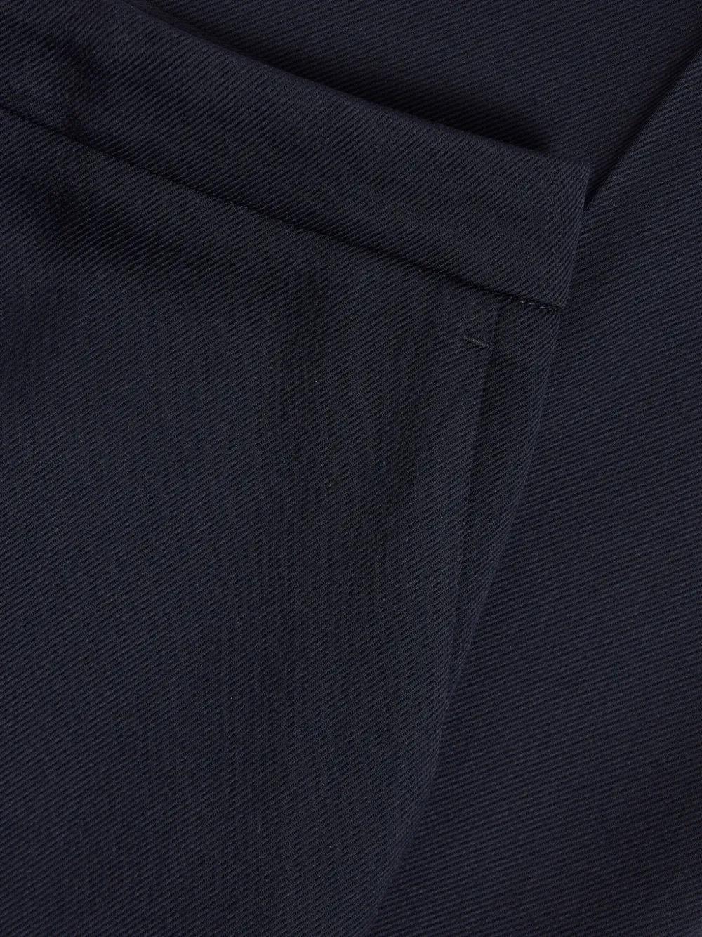 navy blue stretch-design gabardine weave concealed front fastening pressed crease two side slit pockets two rear jetted pockets flared design