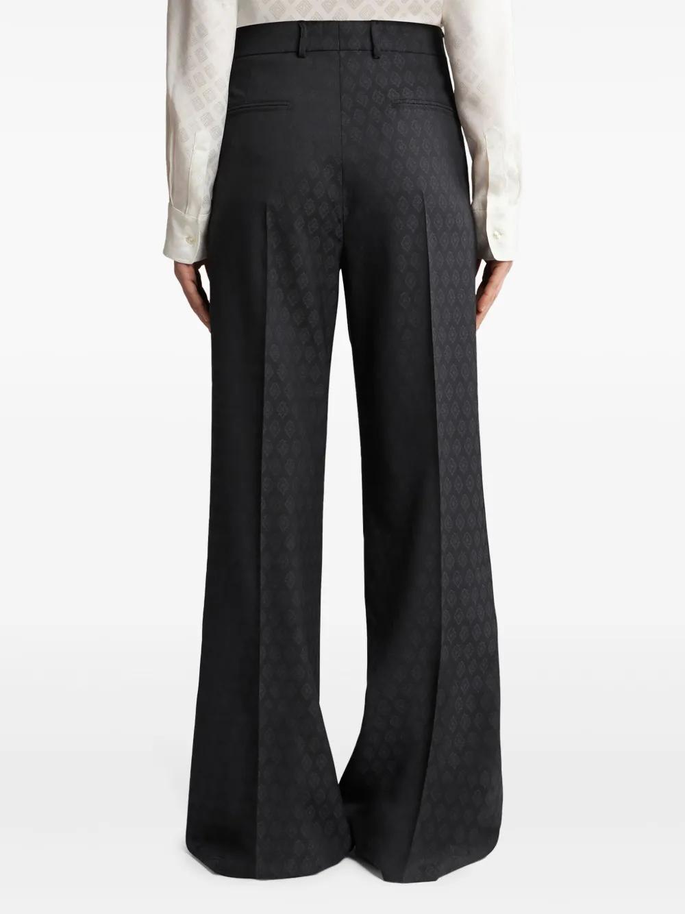 black wool patterned jacquard pleat detailing pressed crease belt loops concealed front fastening two side jetted pockets two rear welt pockets wide leg