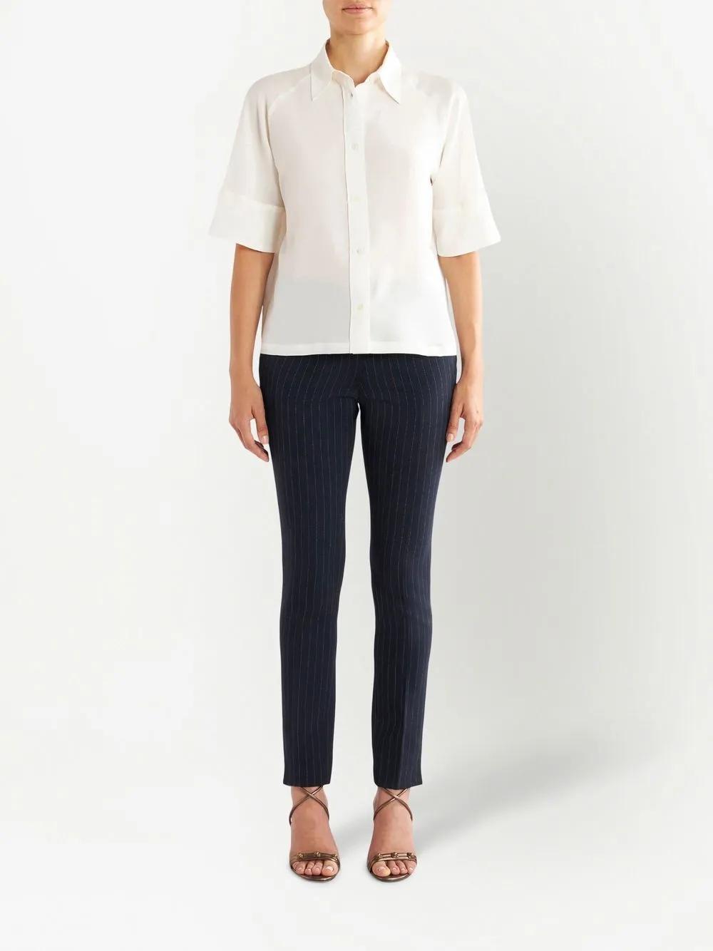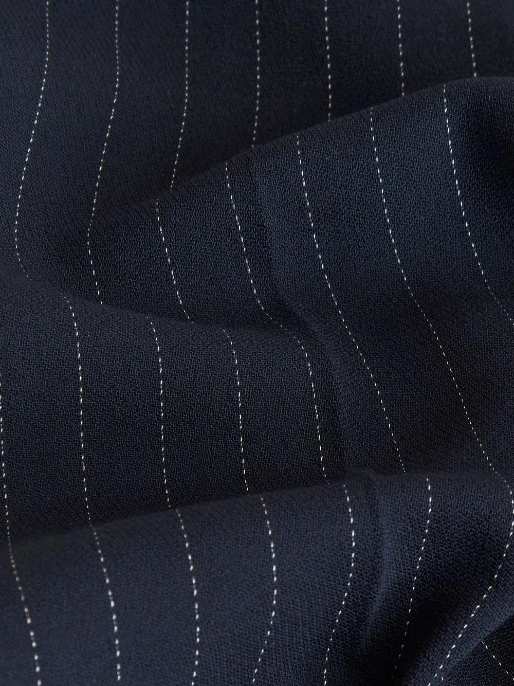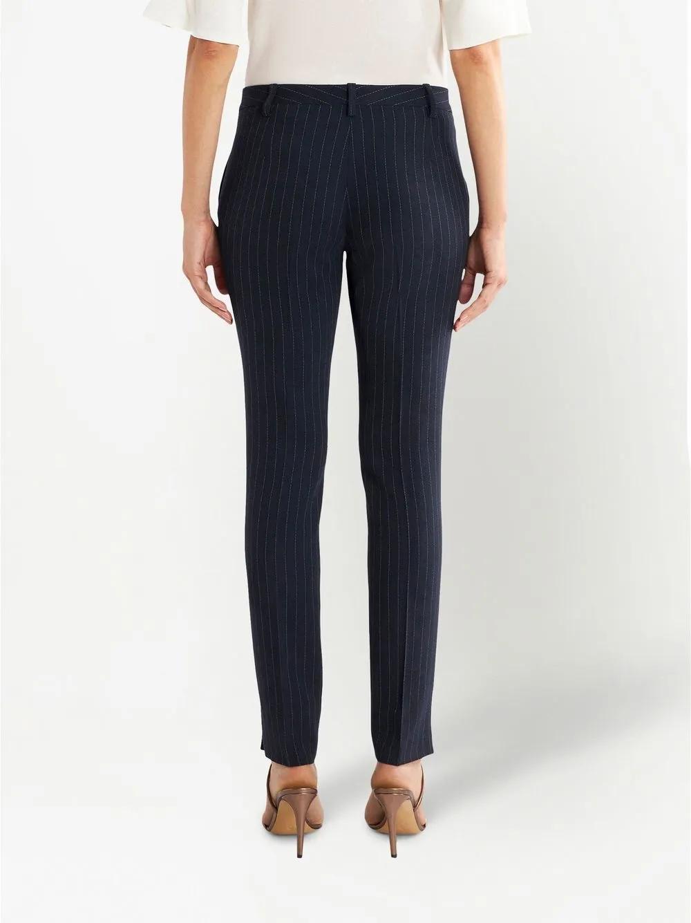 black virgin wool pinstripe pattern belt loops concealed front fastening two side slit pockets pressed crease slim cut