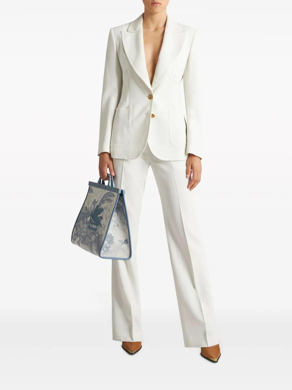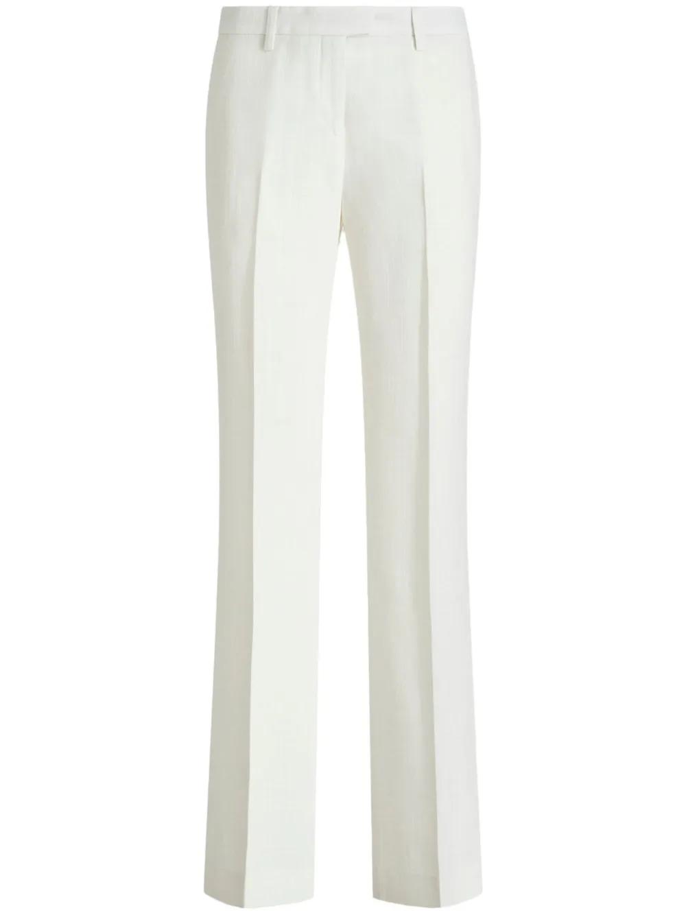 milk white slub texture pressed crease belt loops mid-rise straight leg tailored cut concealed front fastening two side slash pockets two rear button-fastening jetted pockets