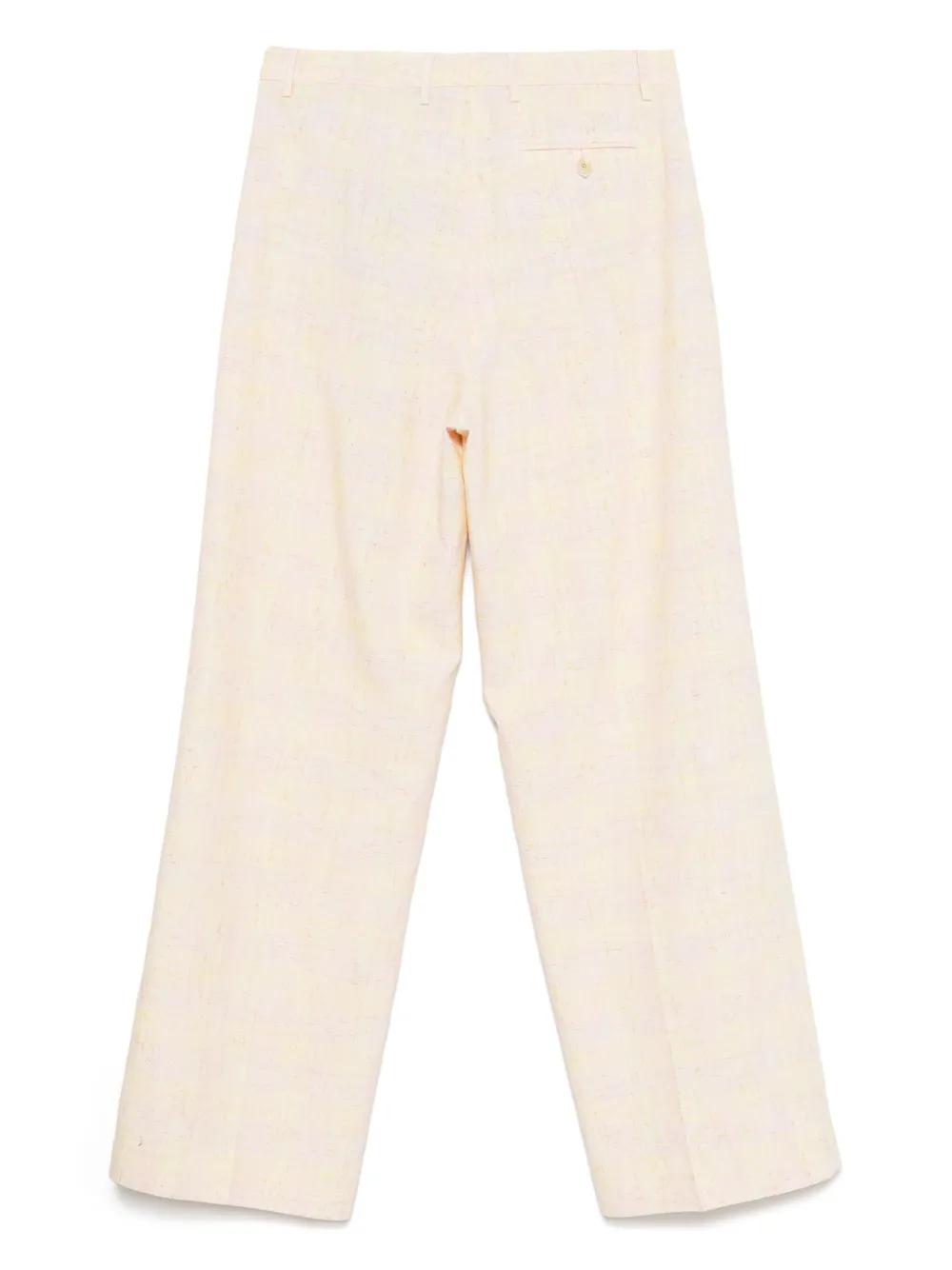 light yellow concealed front button, hook and zip fastening belt loops two diagonal pockets to the sides rear button-fastening jetted pocket