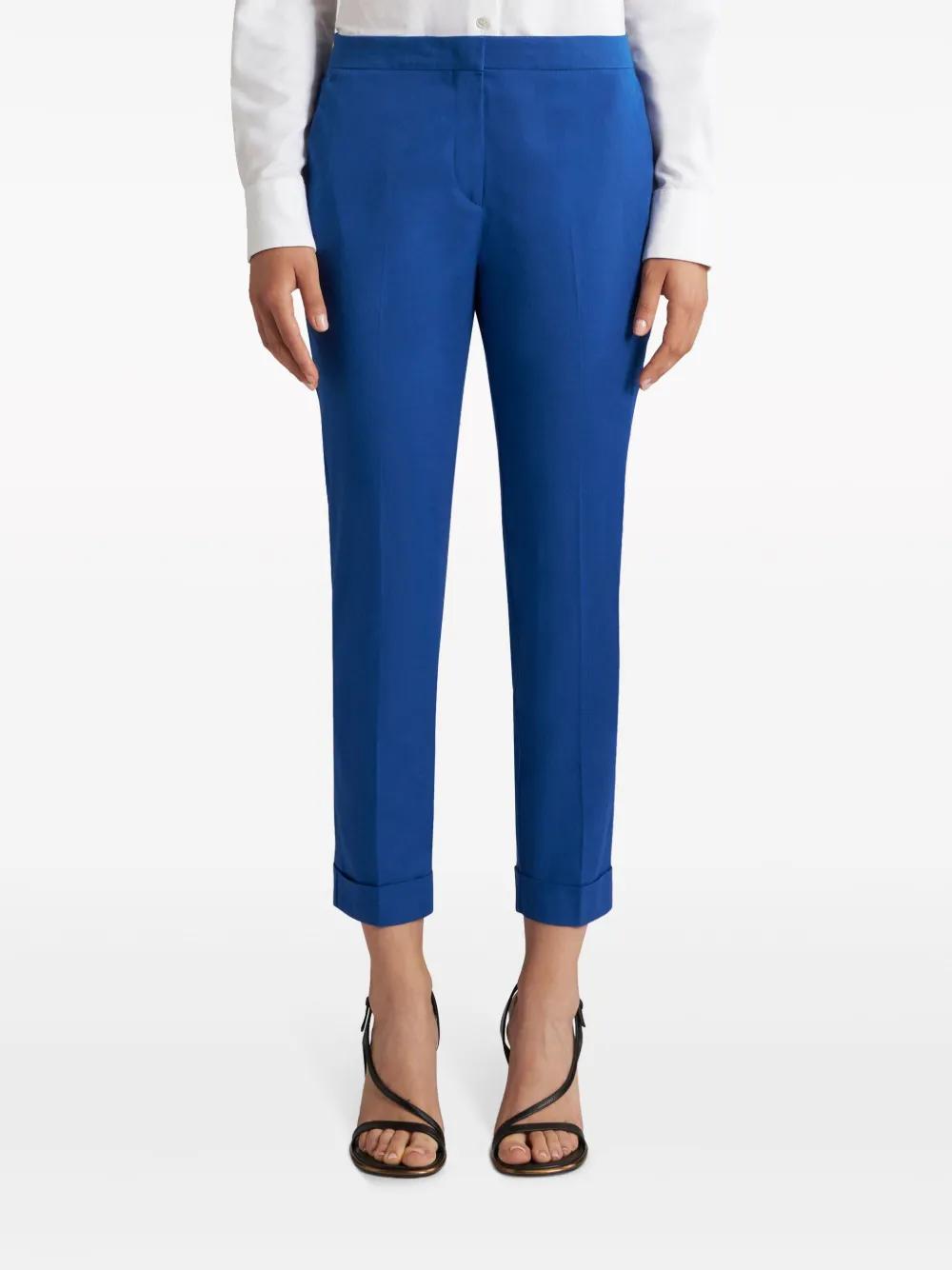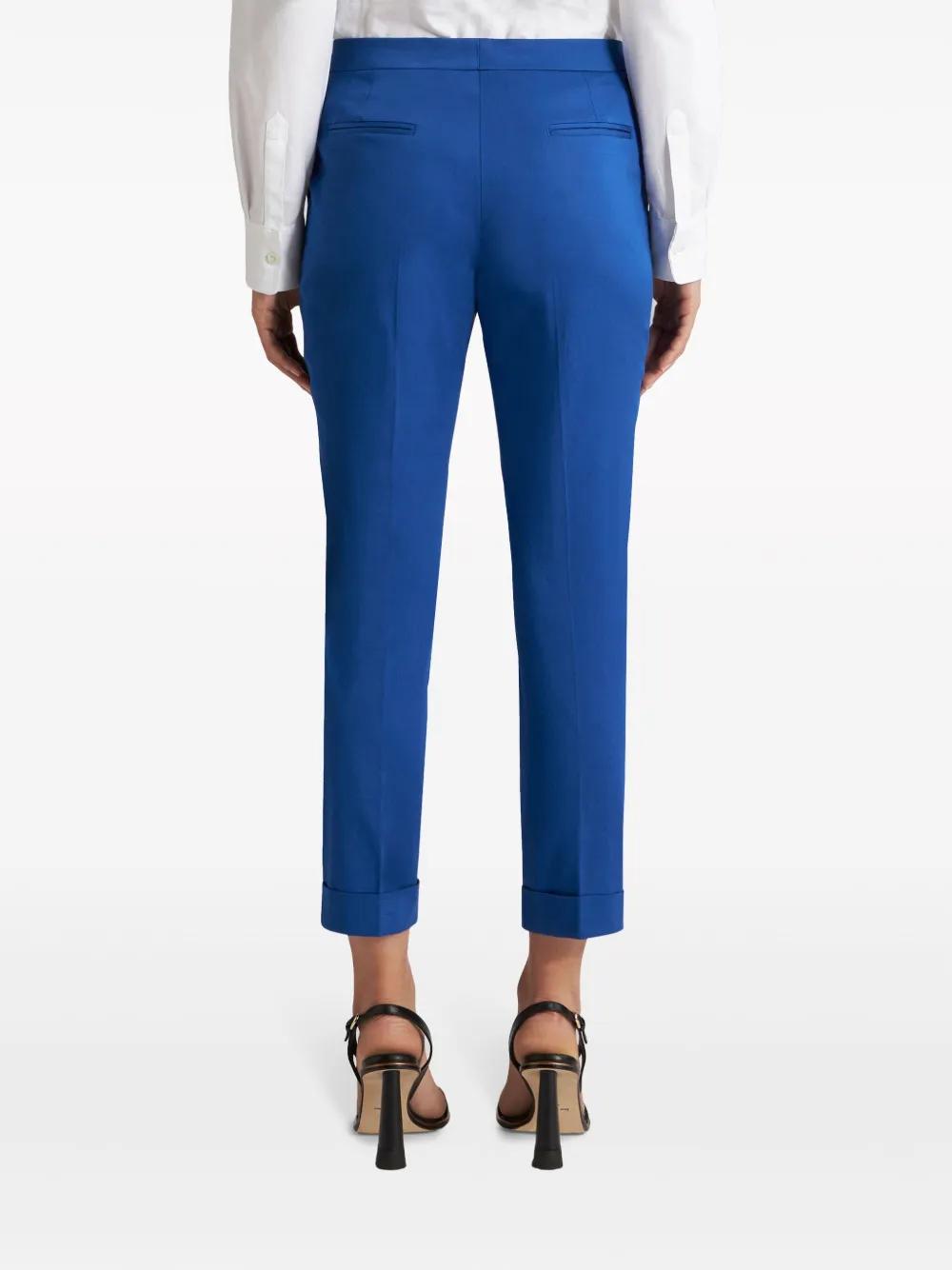 cobalt blue stretch-cotton tailored design mid-rise concealed front fastening two side slit pockets two rear welt pockets tapered leg cropped