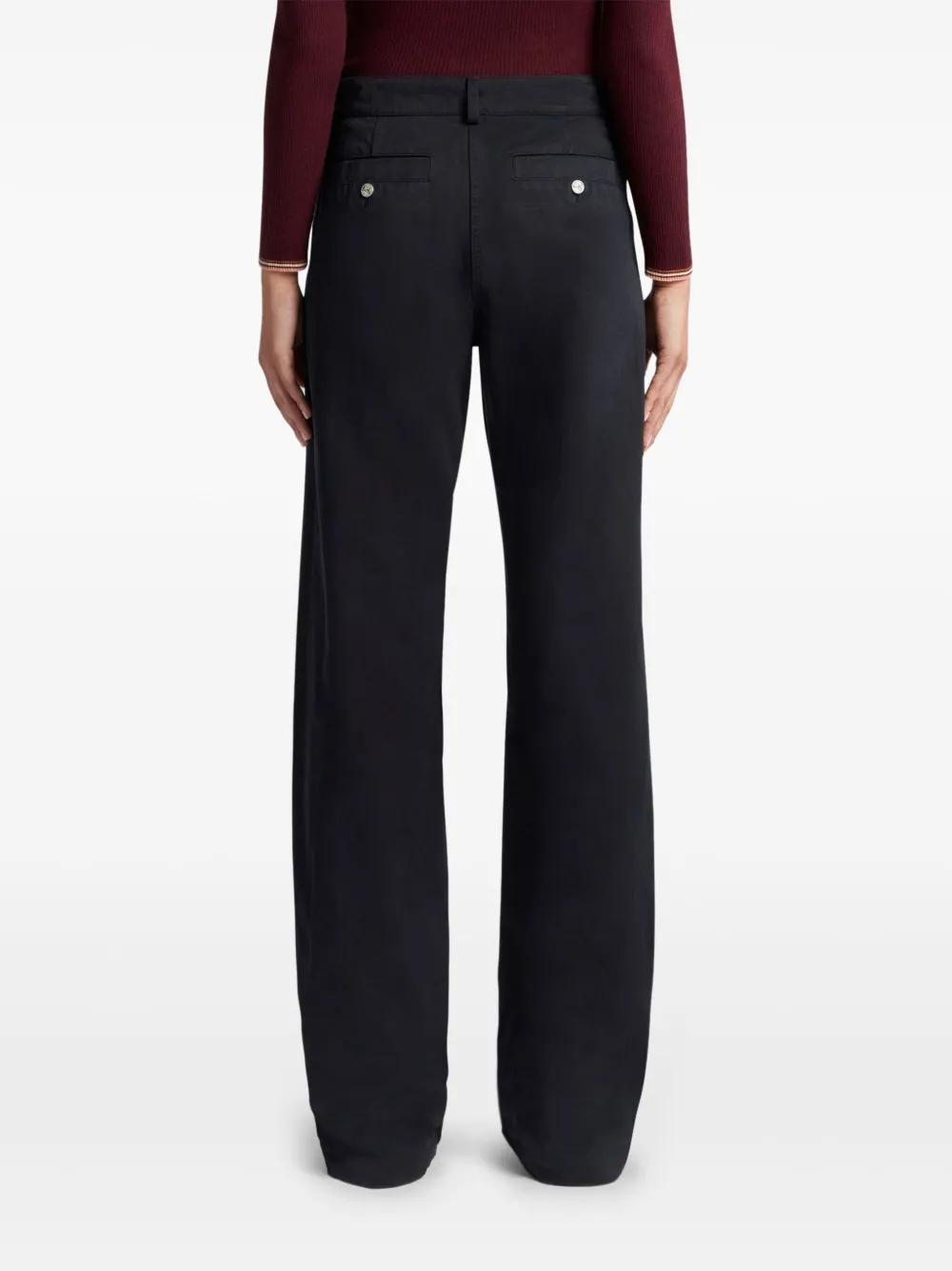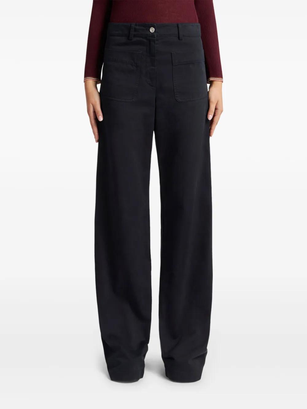 black button fly fastening two front patch pockets two rear welt pockets floor-length