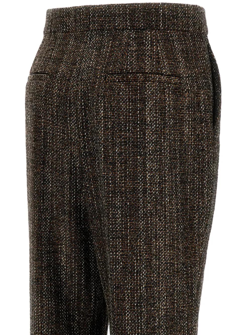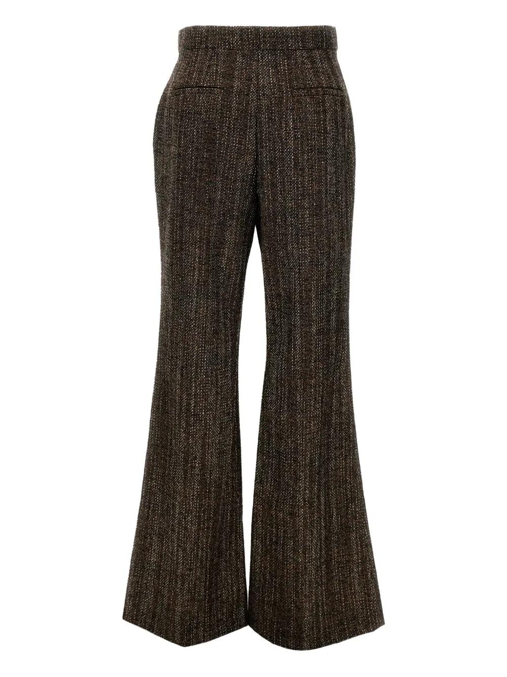 brown tweed texture high waist flared leg two diagonal pockets to the sides concealed front fastening