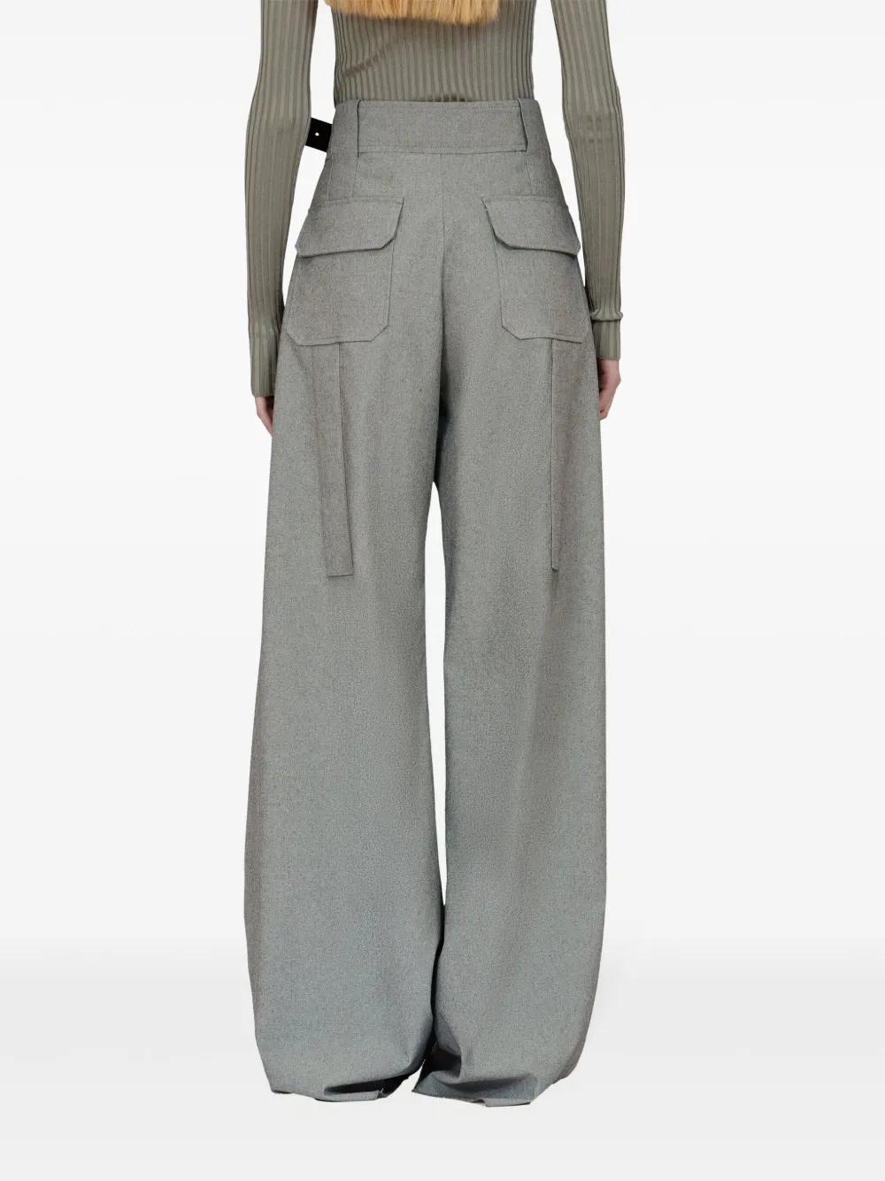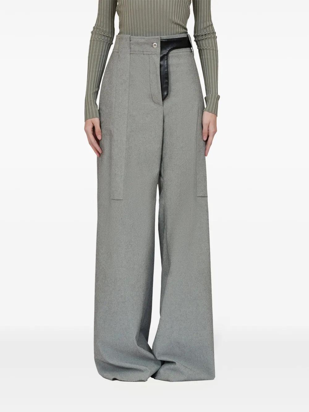 grey/black canvas belt loops adjustable and detachable leather waist strap two side inset pockets pressed crease two rear flap pockets front button fastening