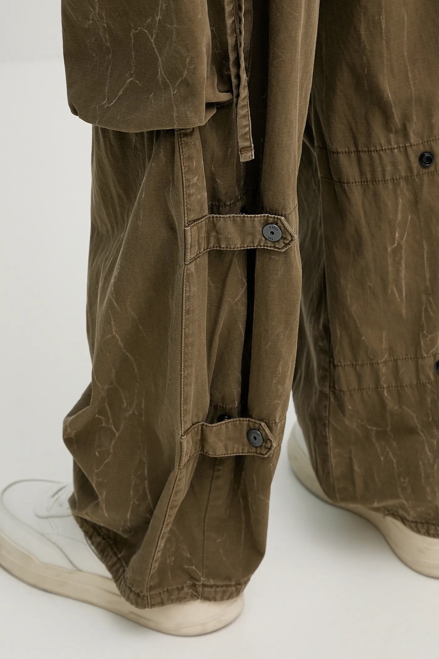 - Podwyższony stan z elastyczną listwą w pasie. - Zapięcie na suwak i zatrzask. - Z przodu dwie wsuwane kieszenie. - Model z kieszeniami, ozdobionymi patkami. - Kieszenie typu cargo zapewniają dodatkową przestrzeń do przechowywania drobnych przedmiotów. - Regulacja szerokości nogawki za pomocą zatrzasków.