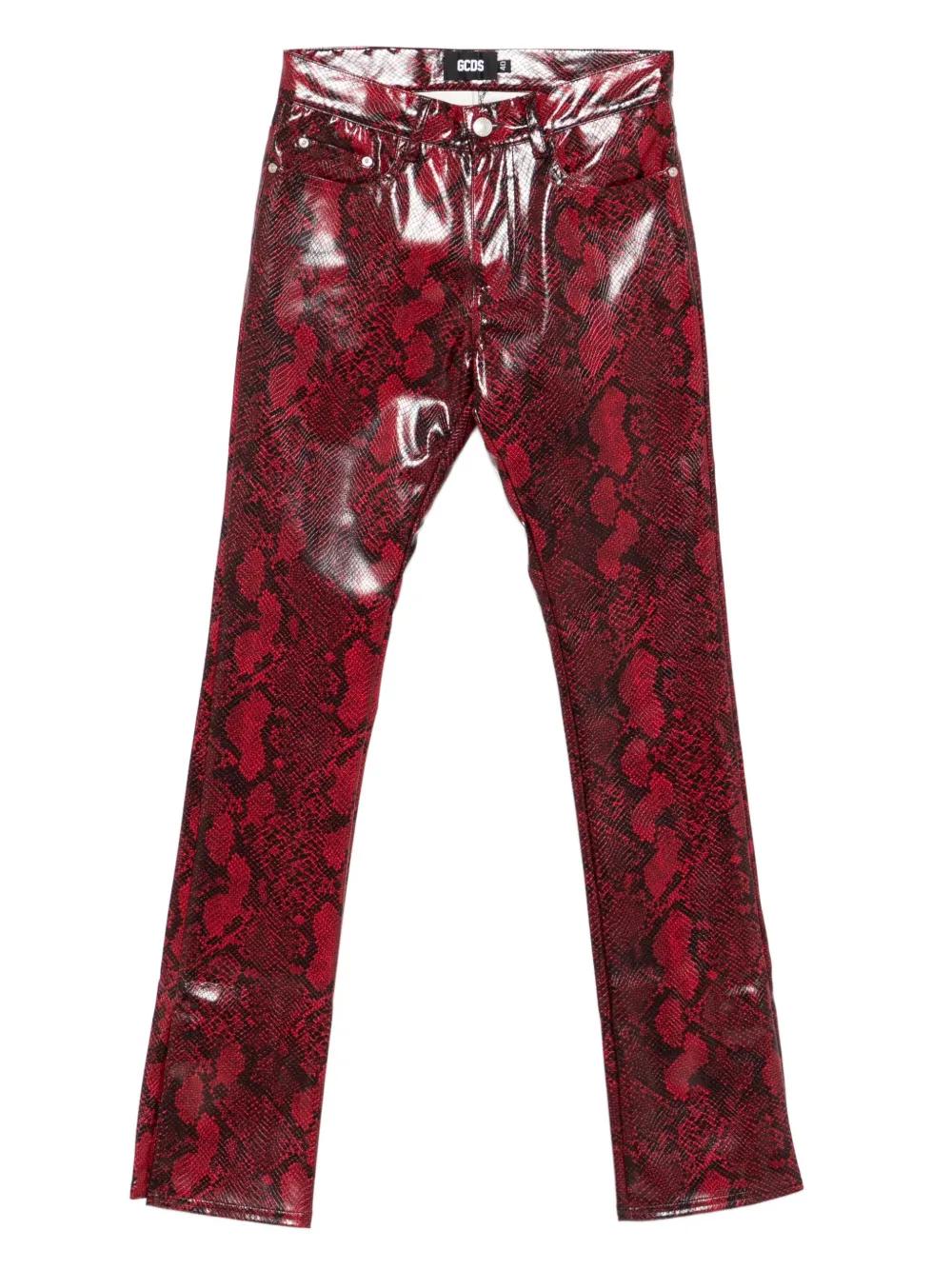 red snakeskin print high shine finish five pockets belt loops button fastening