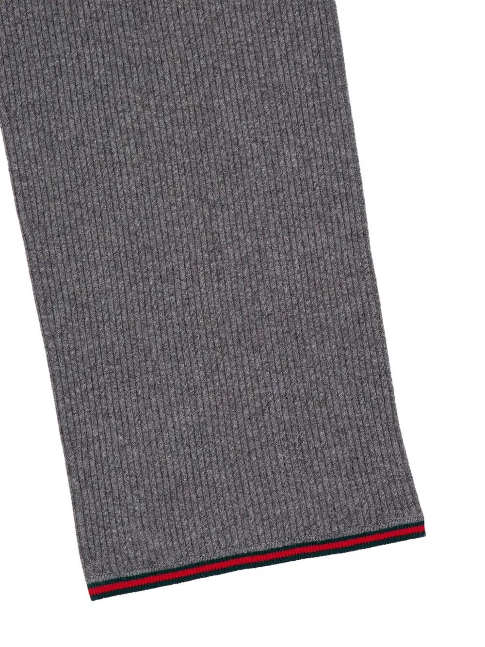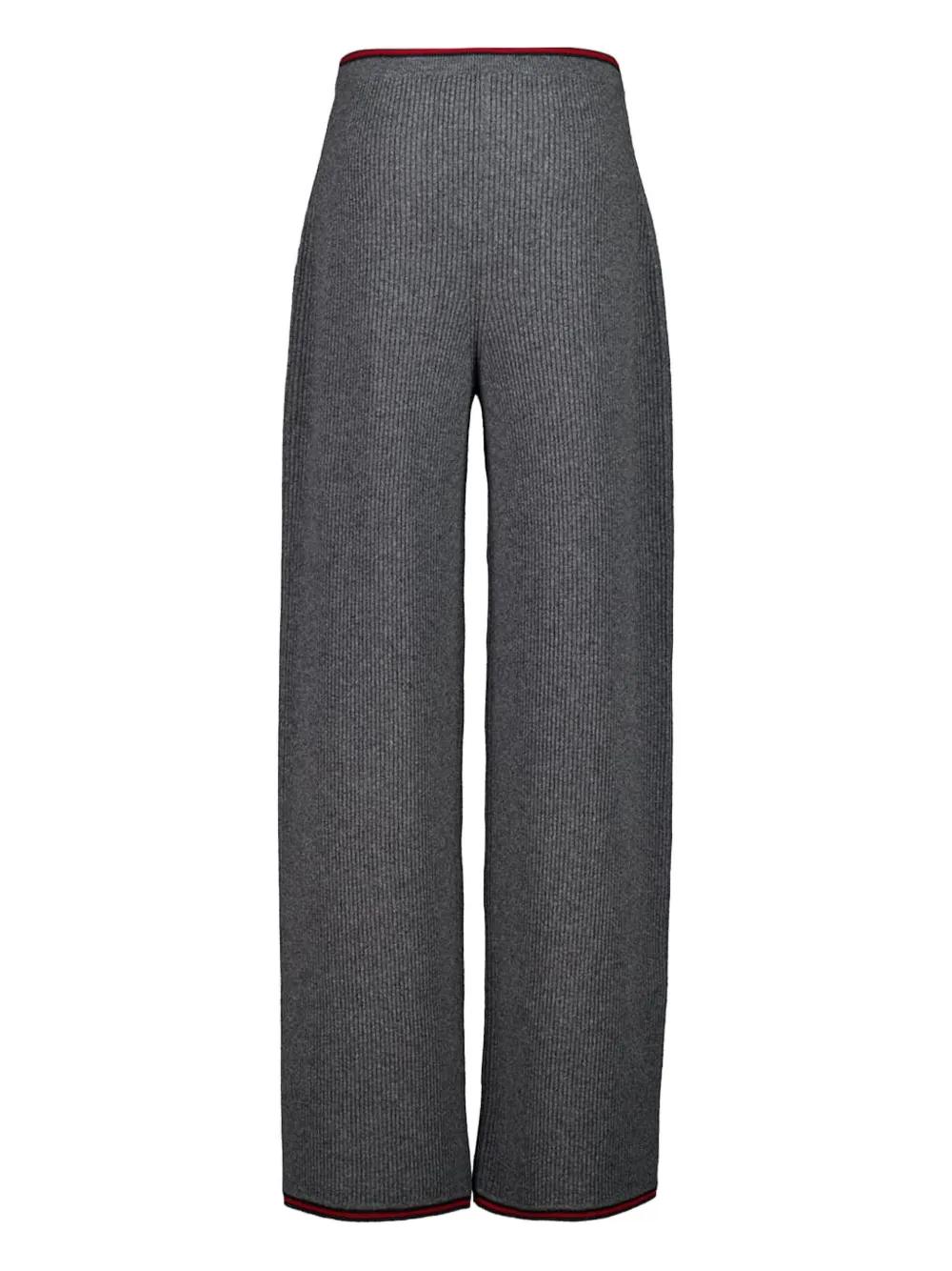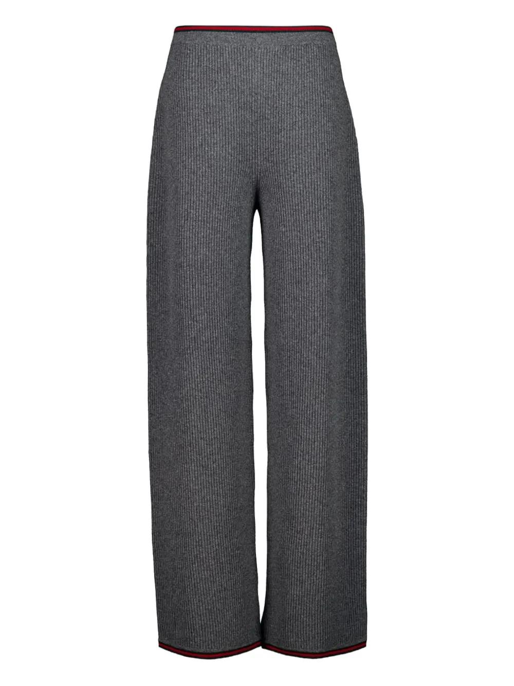 dusty dark grey wool ribbed knit straight leg red and green striped trim elasticated waistband