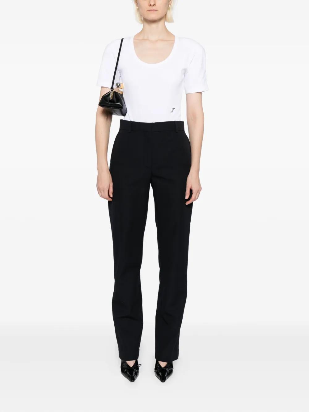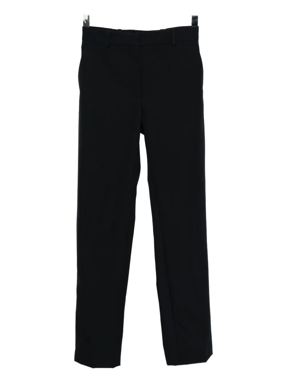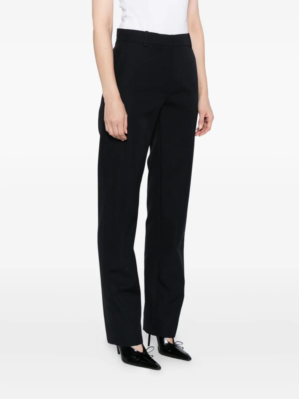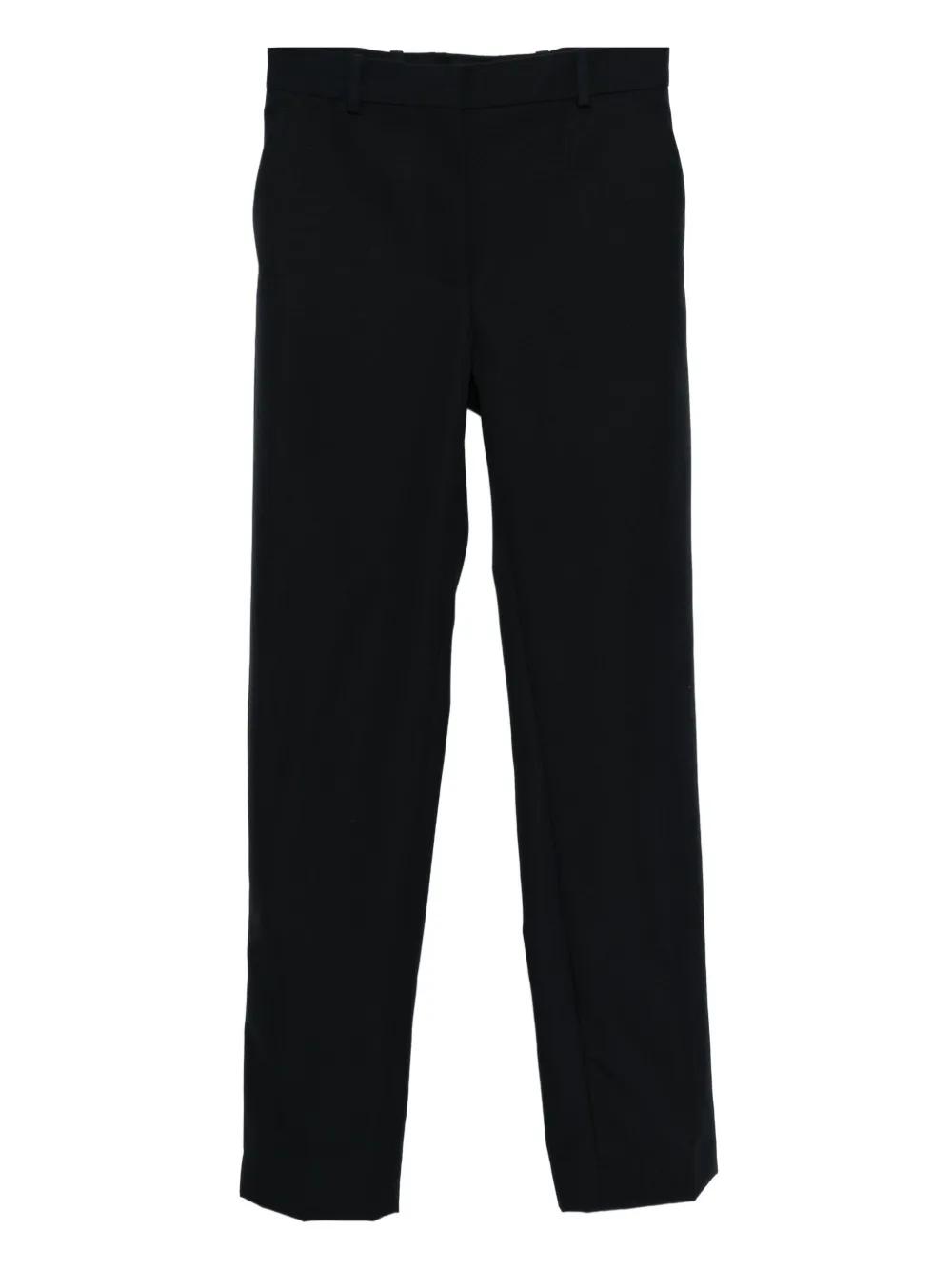 dark blue front button and zip fastening two side inset pockets two rear welt pockets