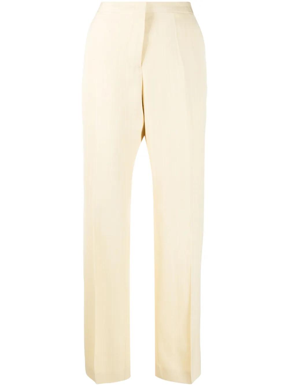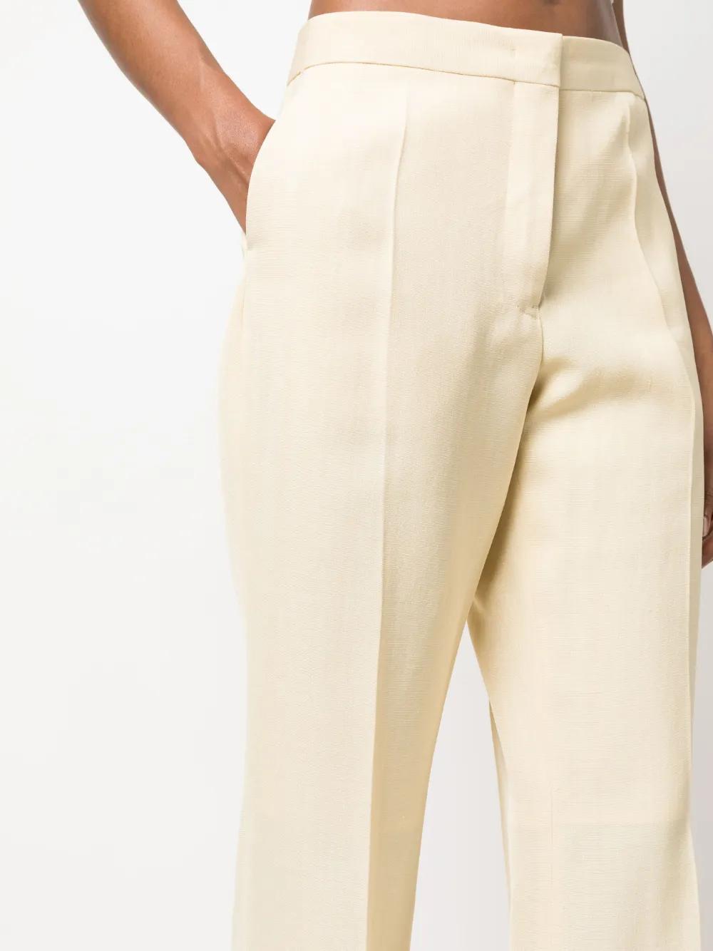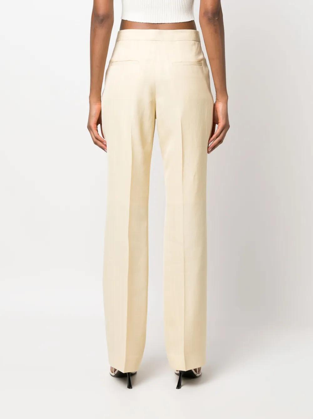 butter yellow cotton pressed crease concealed front fastening straight leg two side slit pockets