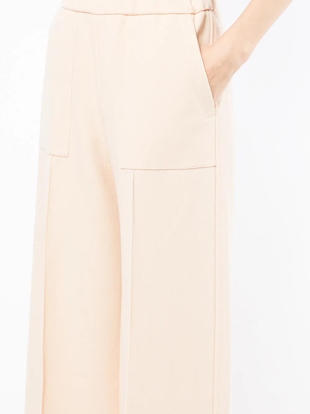 cream virgin wool tonal stitching high waist elasticated waistband two side inset pockets rear welt pocket pressed crease wide leg ankle-length