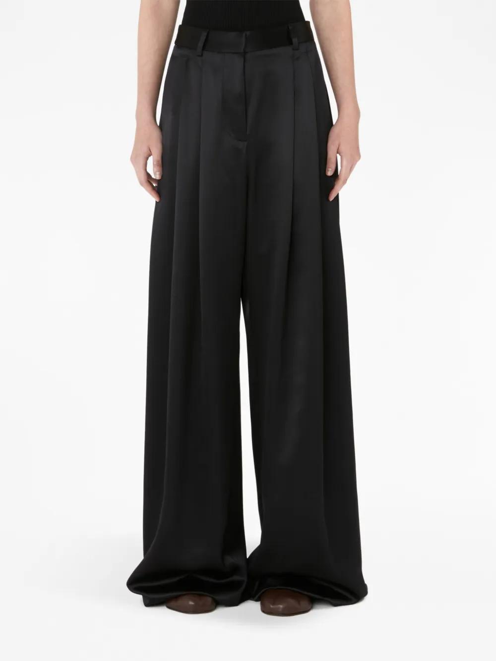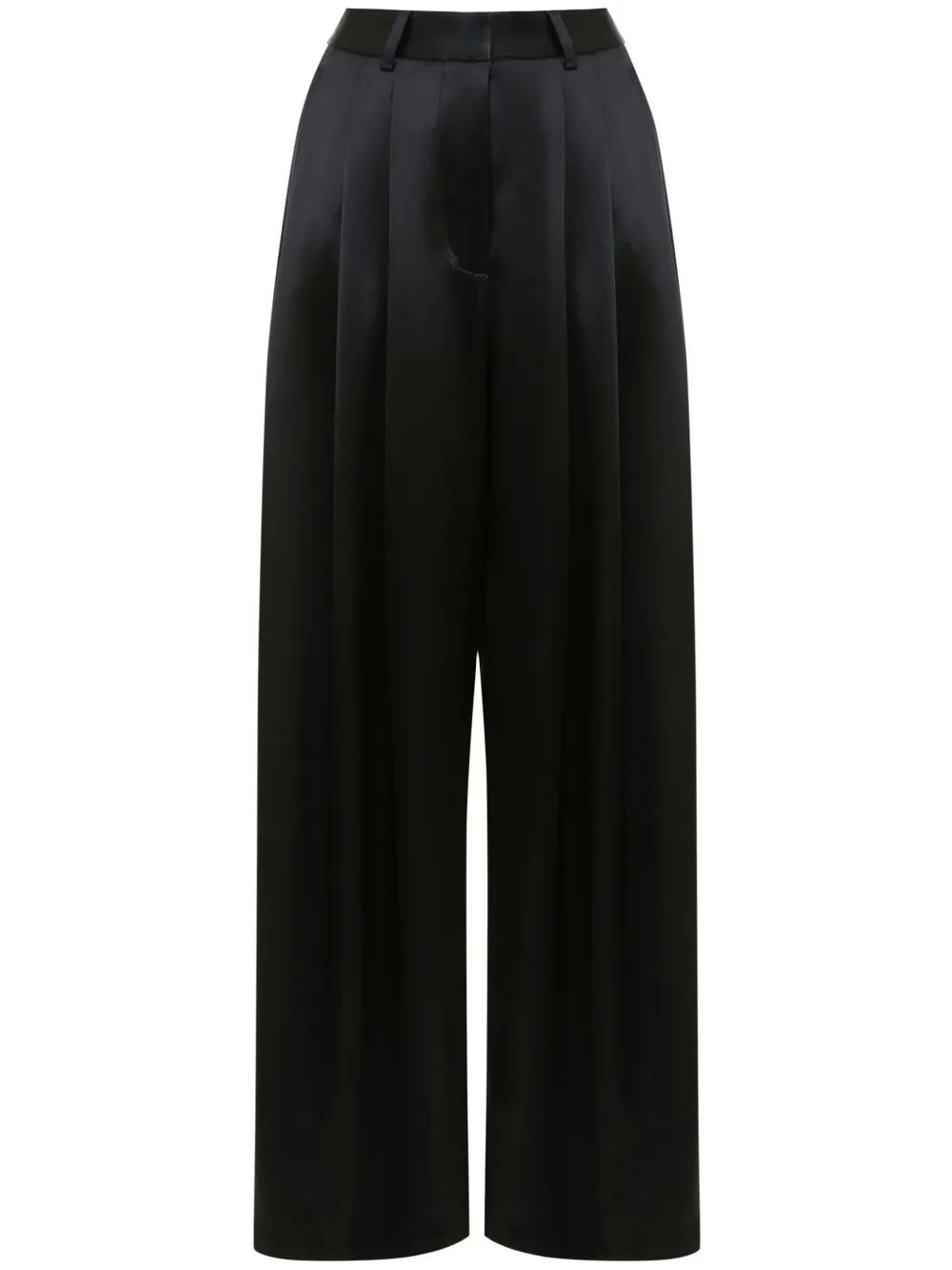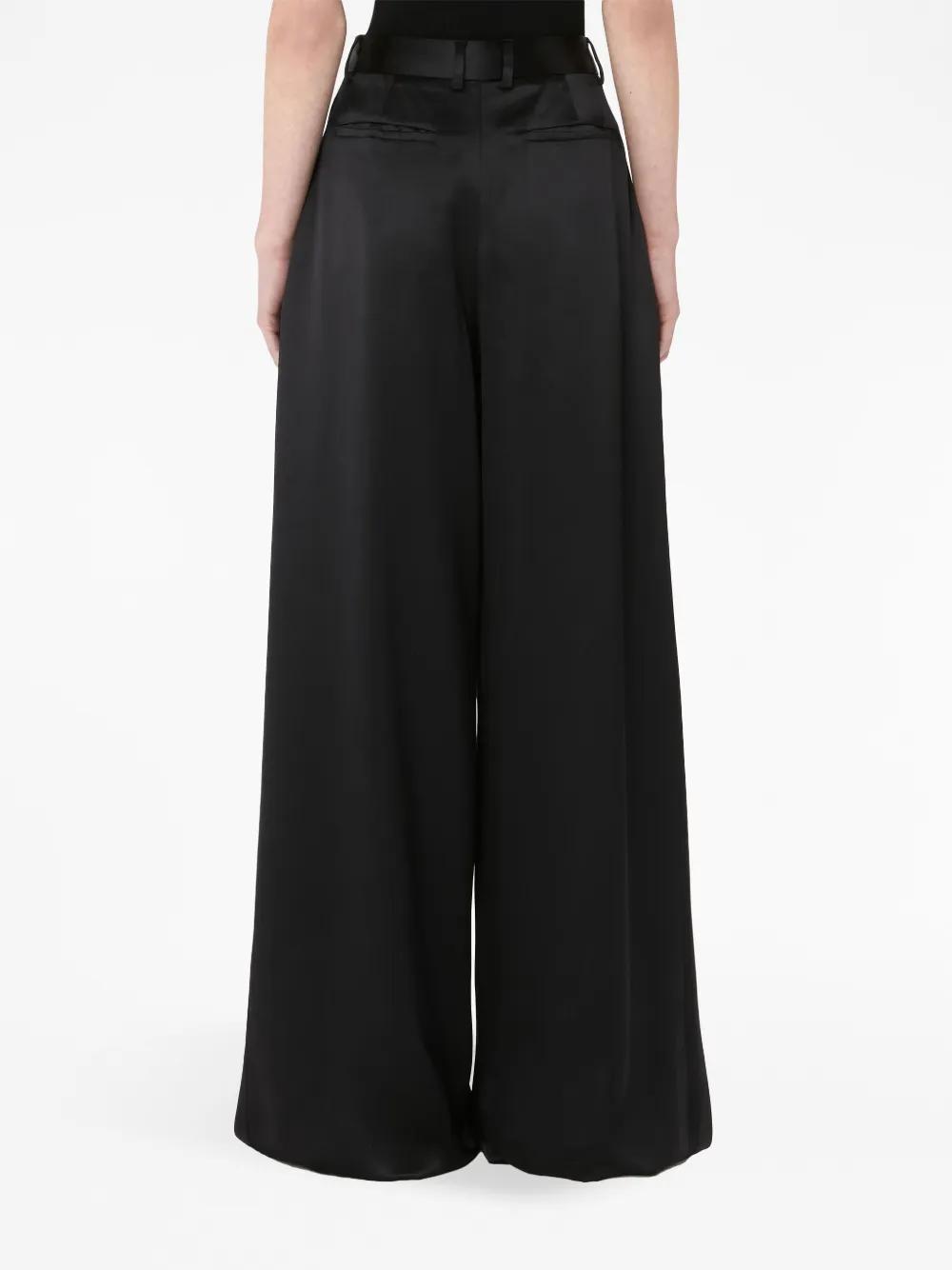 black satin finish pleat detailing belt loops concealed front fastening high-waisted wide leg two side slit pockets rear welt pocket straight hem