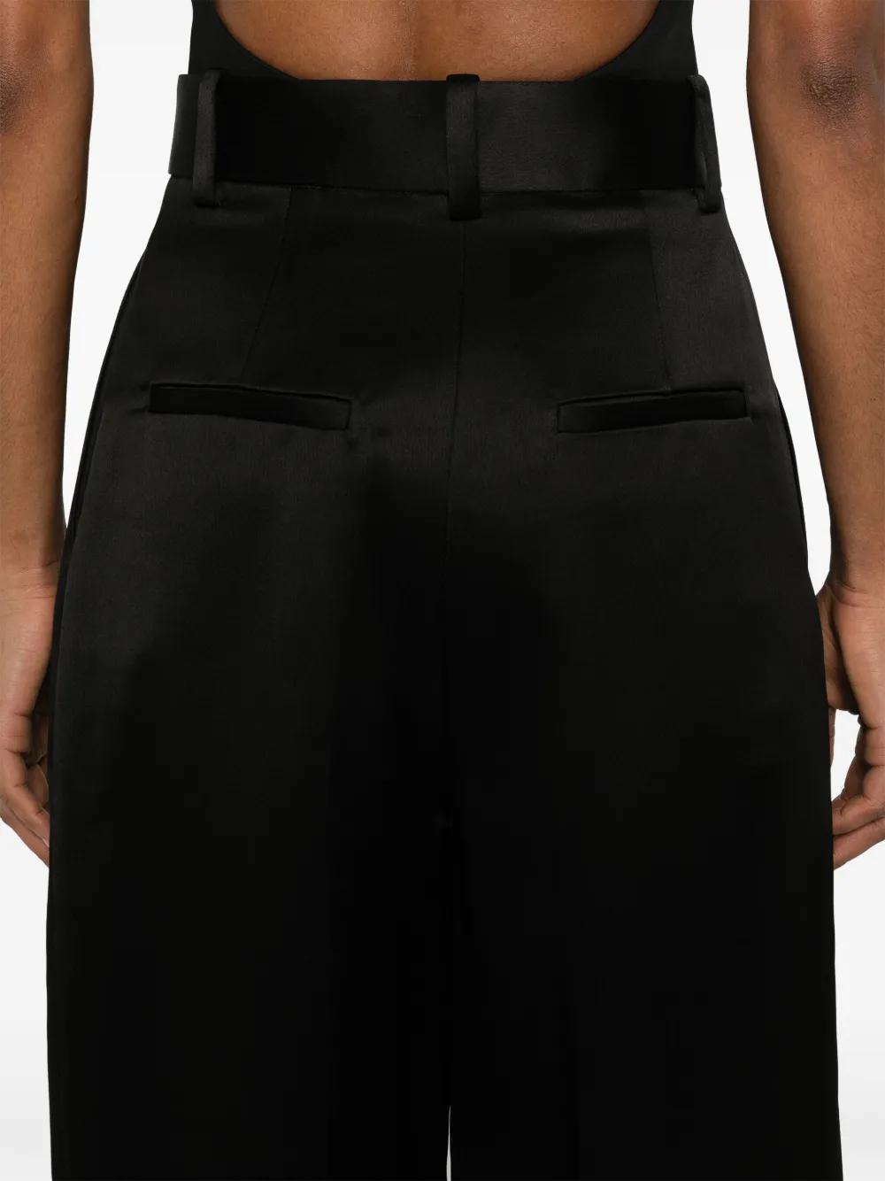 black concealed front button, hook and zip fastening belt loops two side slash pockets two rear welt pockets