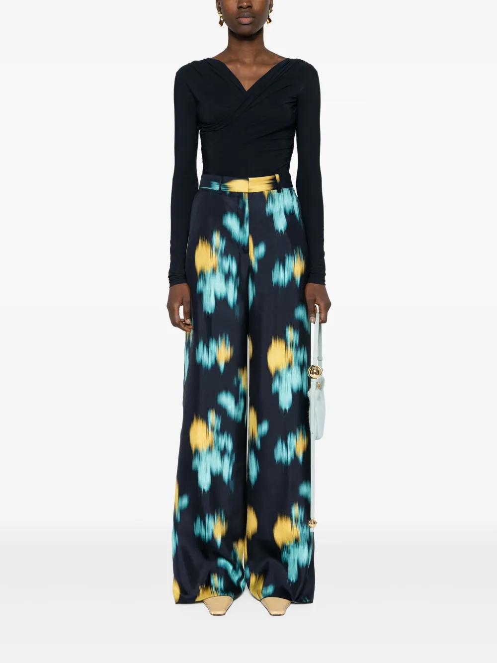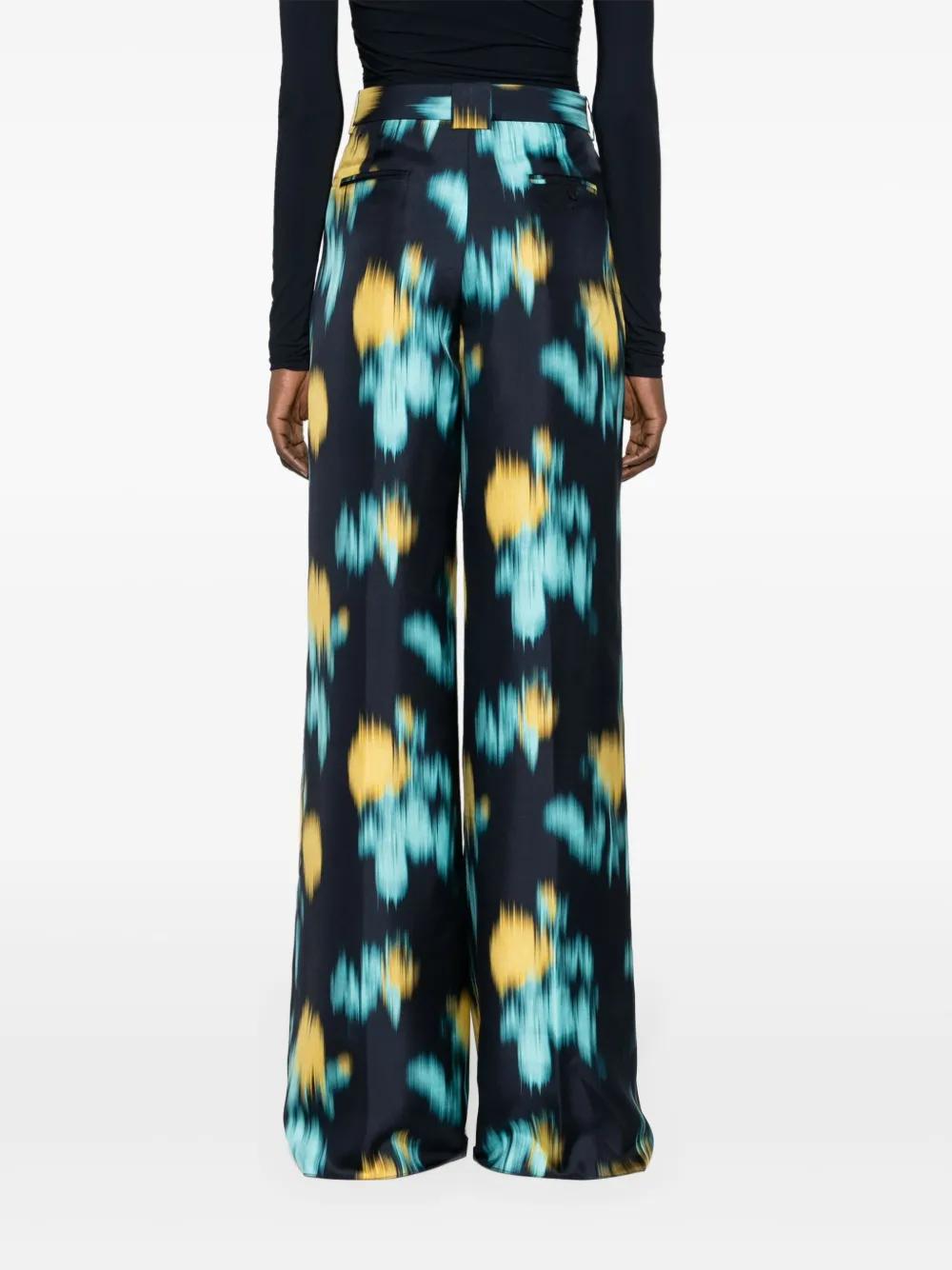 navy blue/multicolour silk twill weave satin finish all-over abstract print belt loops two side slash pockets floor-length two rear jetted pockets wide leg concealed front button, hook and zip fastening