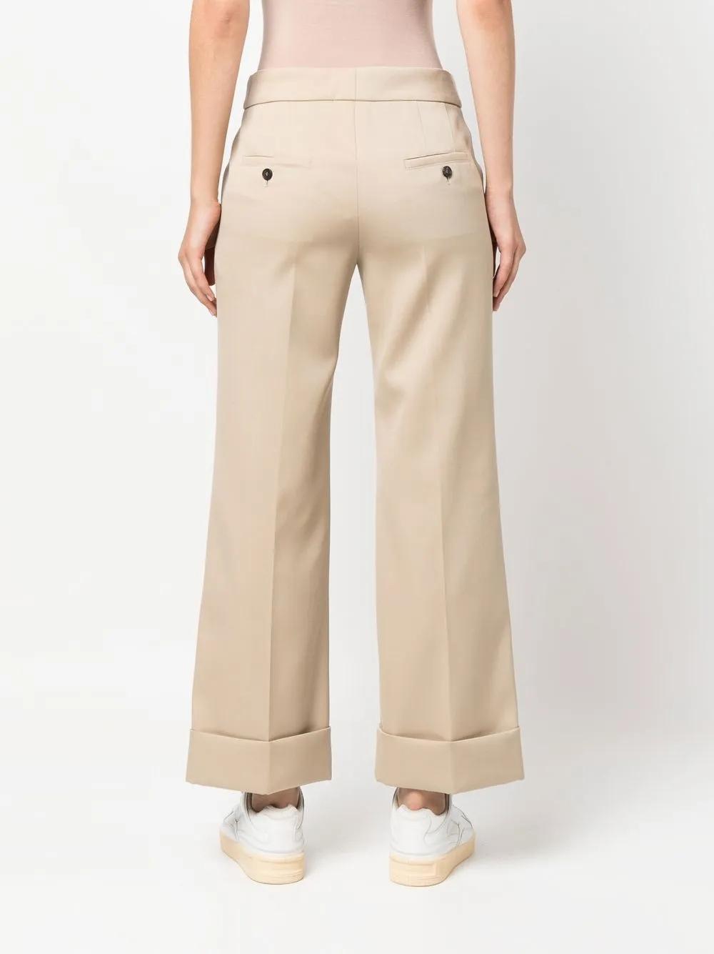 light beige wool mid-rise pressed crease front button and zip fastening two rear welt pockets wide leg cropped leg folded edge
