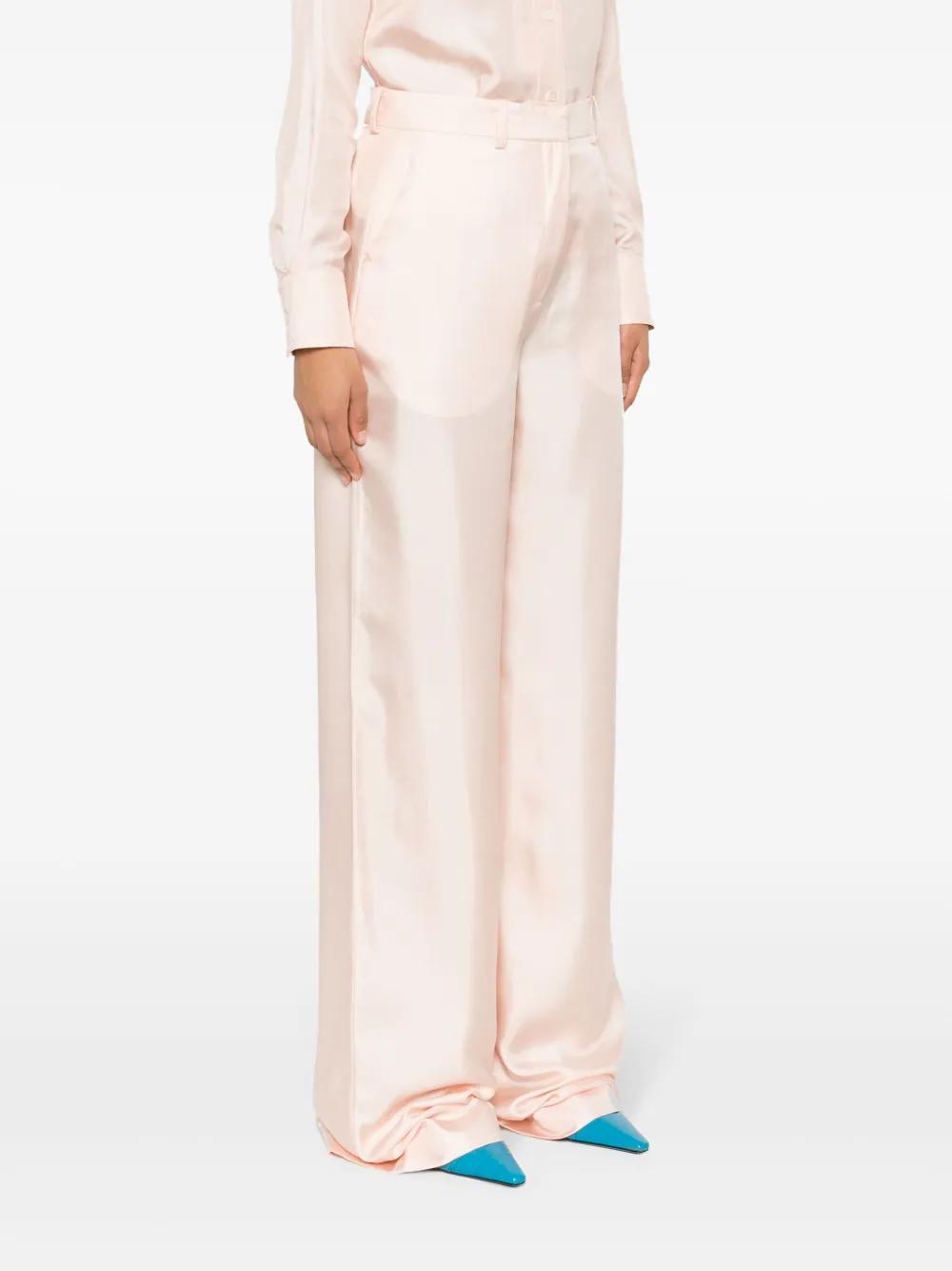light pink silk belt loops at the waist two side slash pockets two rear jetted pockets logo print to the rear unlined wide leg concealed front button, hook and zip fastening