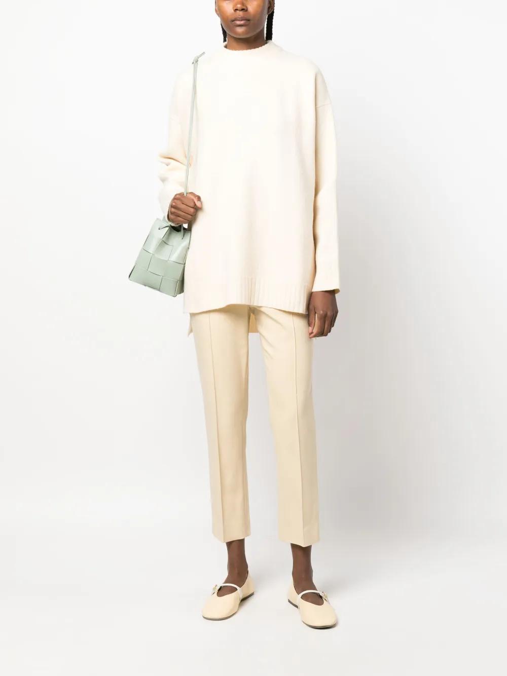light beige cotton high waist belt loops concealed front fastening two side inset pockets two rear welt pockets cropped leg