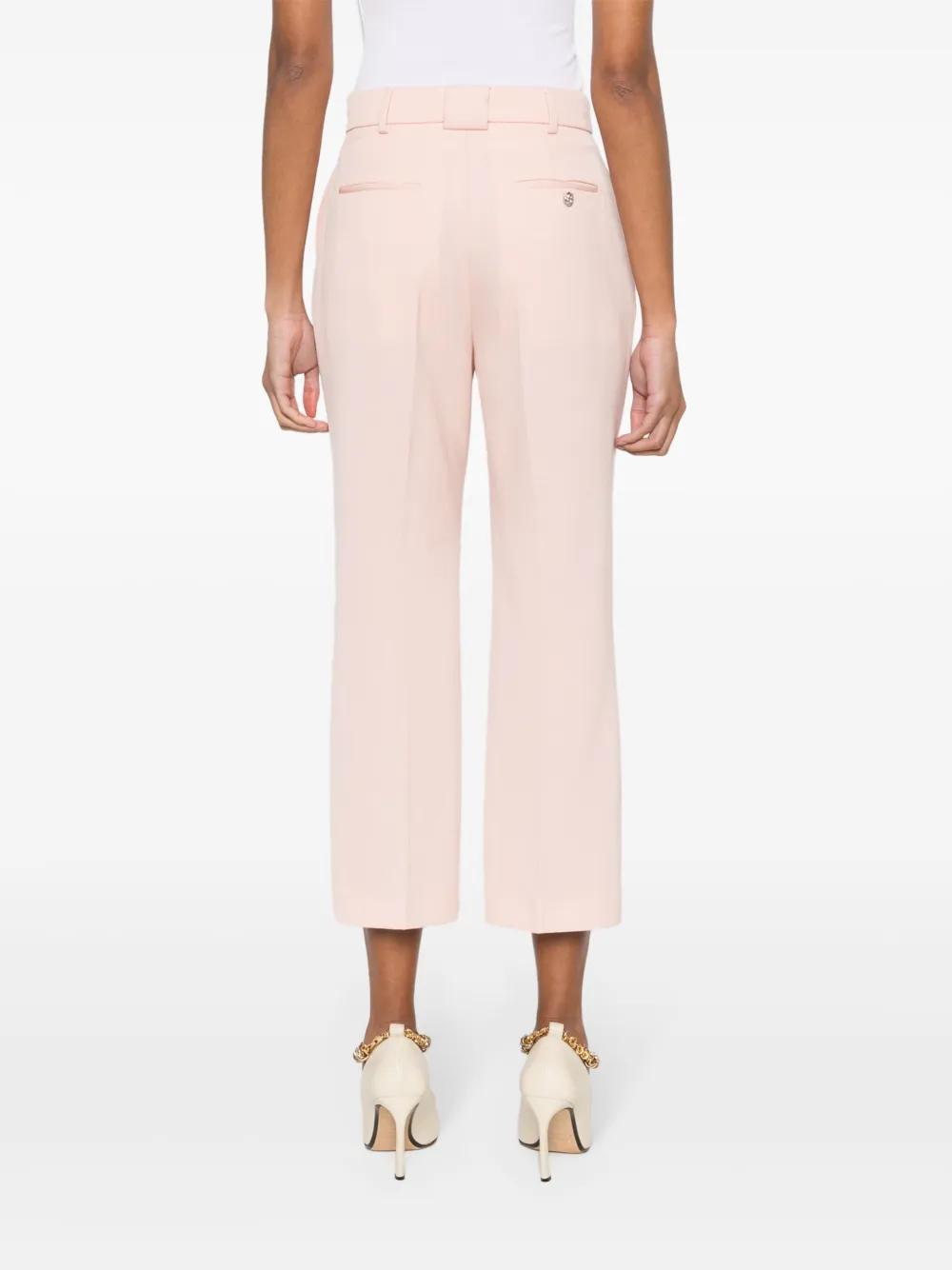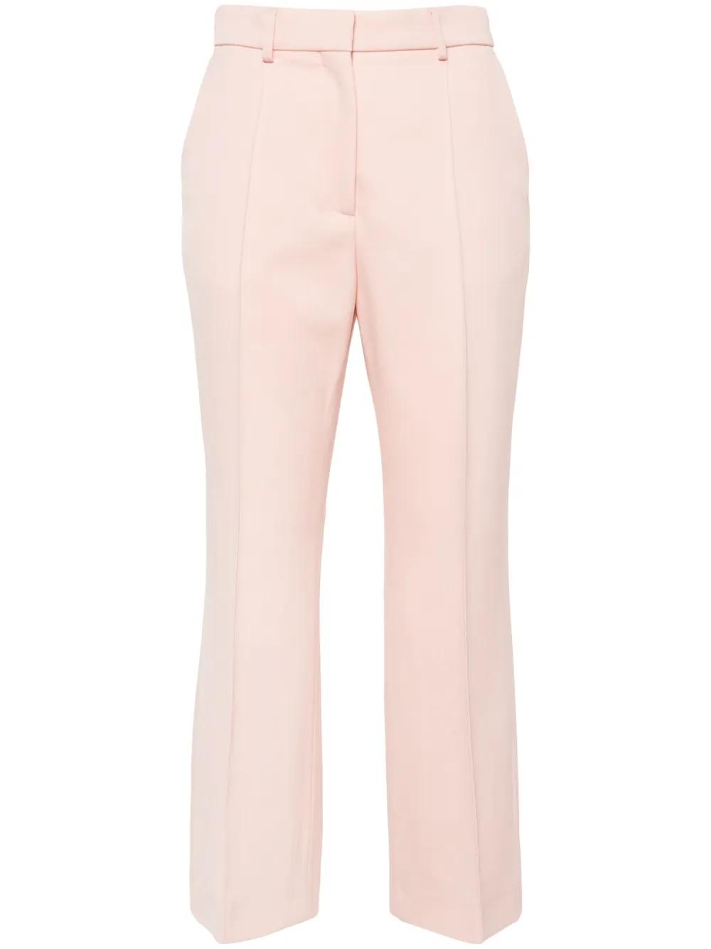 salmon pink wool textured finish belt loops at the waist raised seam detail two side slash pockets two rear welt pockets floral-engraved button to the rear internal logo tag flared hem concealed front button, hook and zip fastening