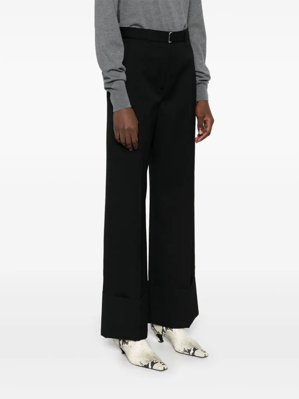 black wool concealed front button, hook and zip fastening belt loops pressed crease two diagonal pockets to the sides rear jetted pocket rear button-fastening jetted pocket turn-up hem