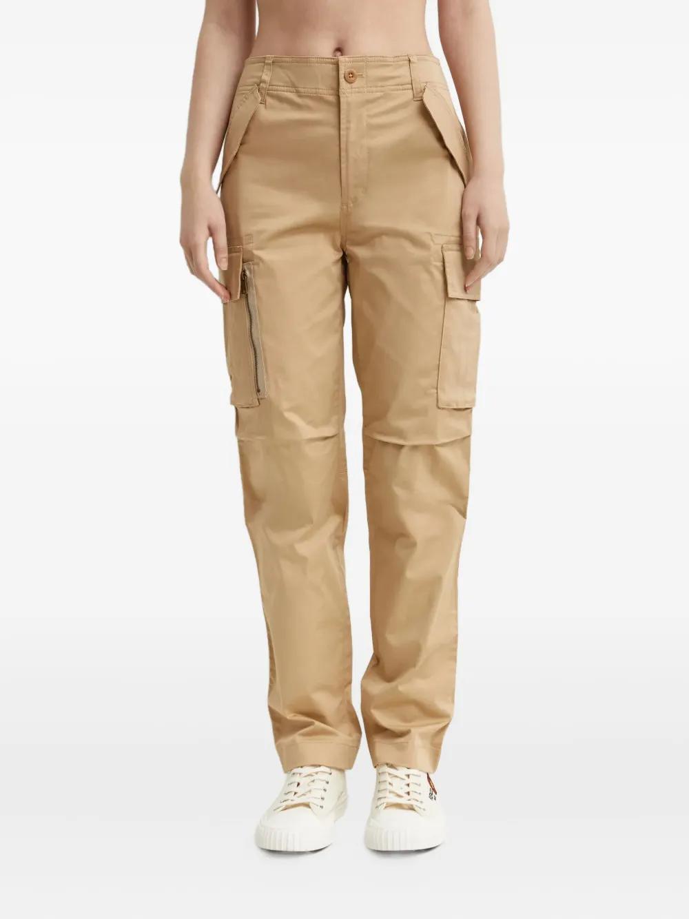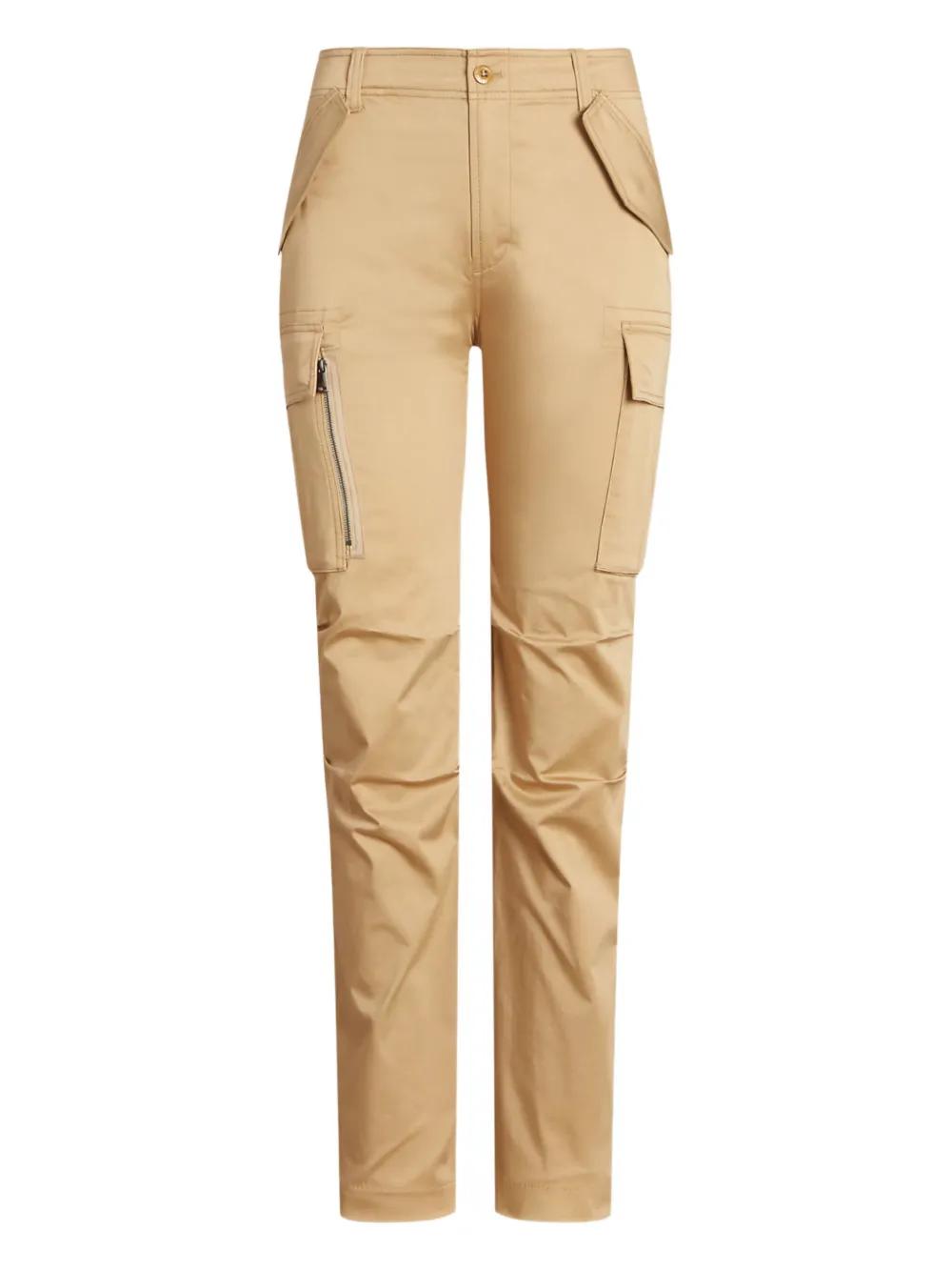 beige cargo style front flap pockets back flap pockets zip side pockets knee pleats
