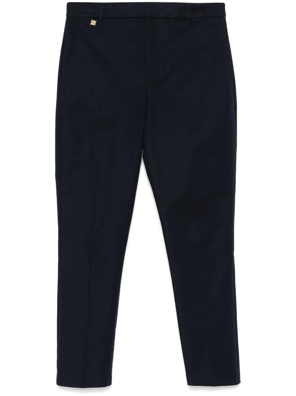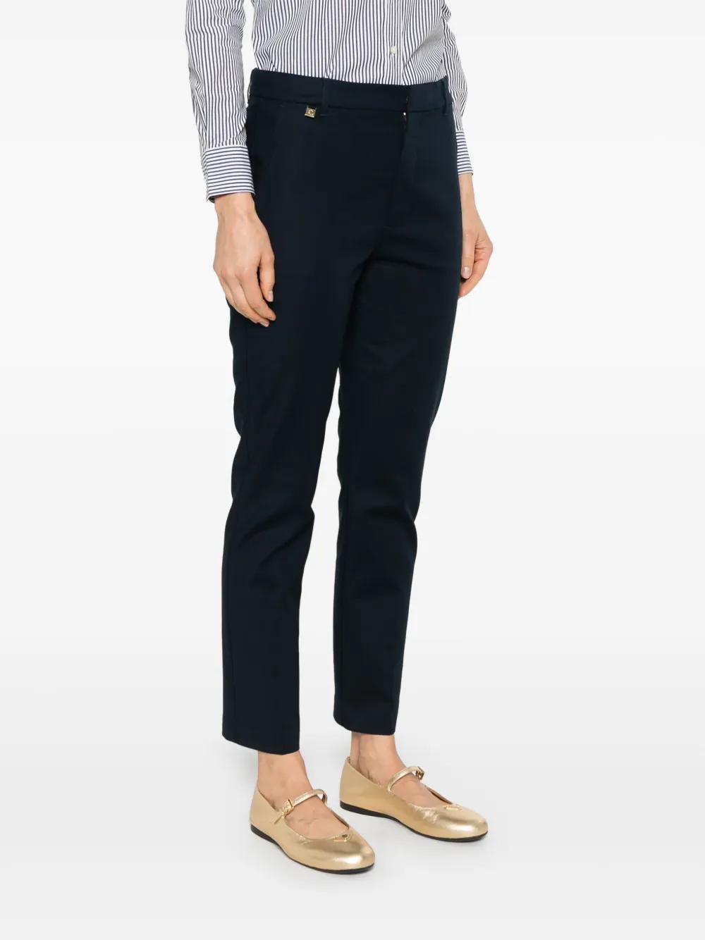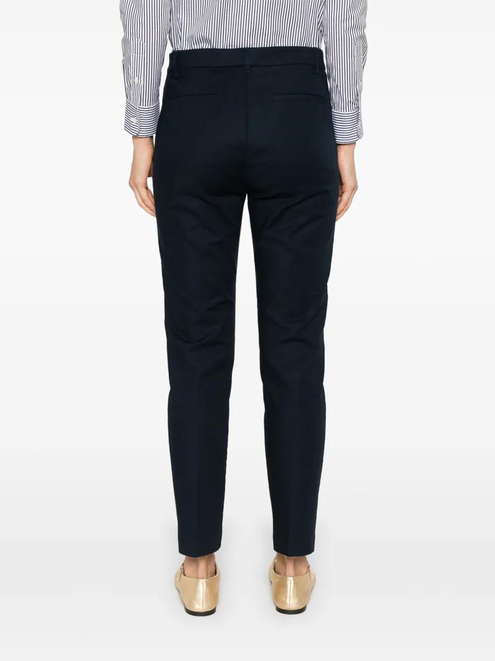 navy blue concealed front button, hook and zip fastening belt loops two side zip-fastening pockets two rear welt pockets