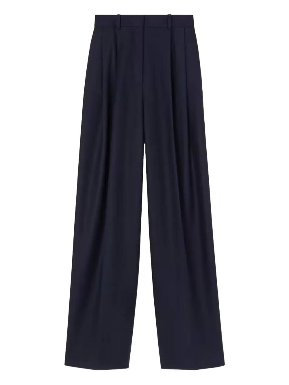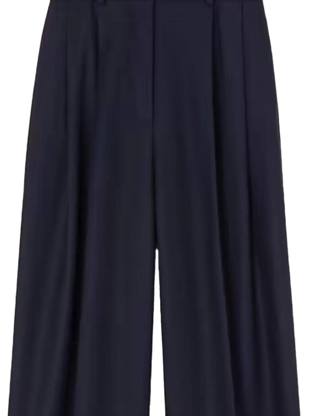 dark blue silk pleat details belt loops concealed fastening