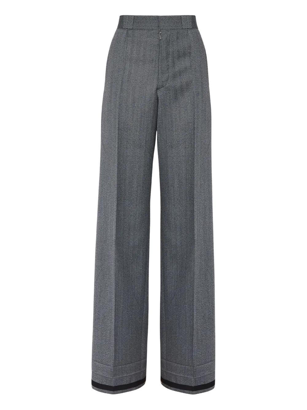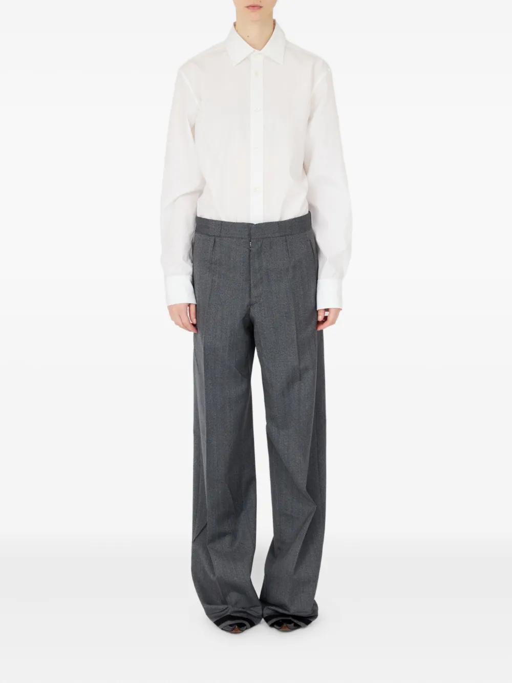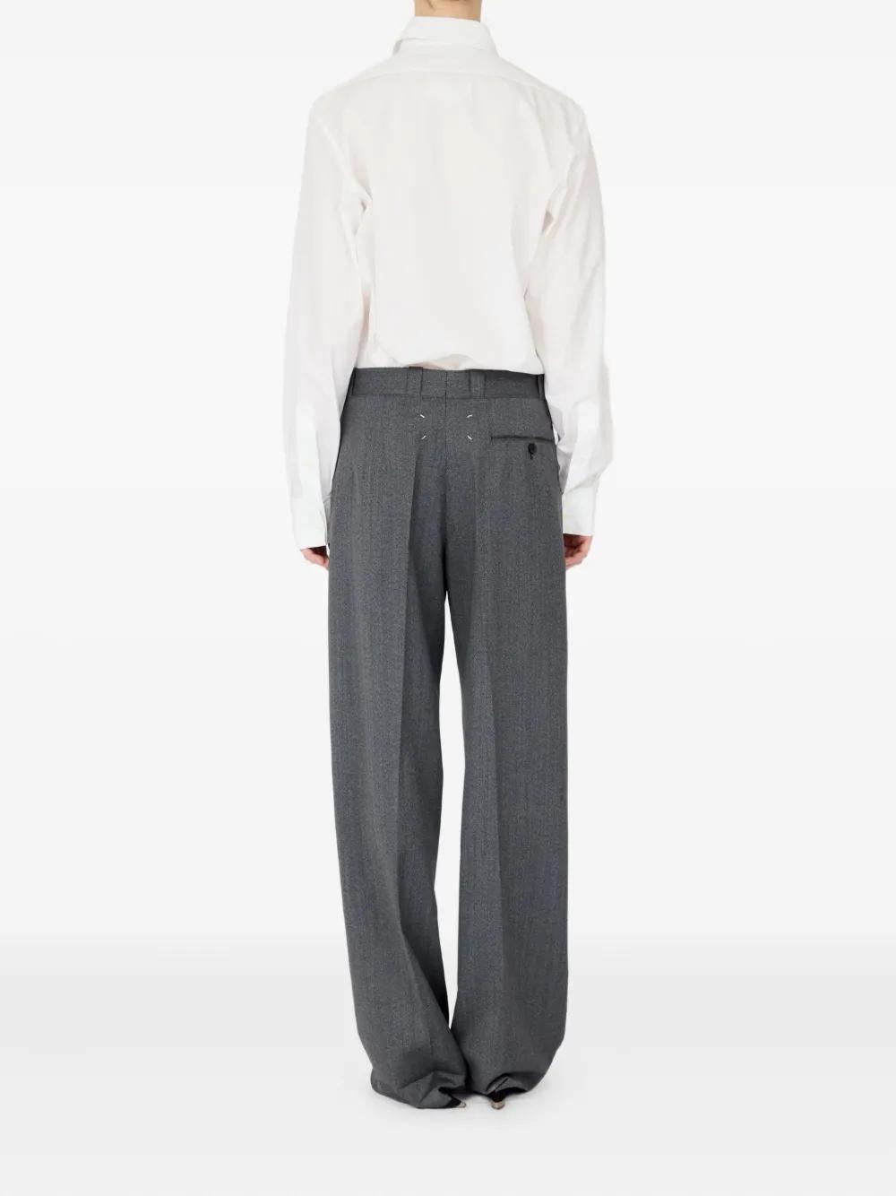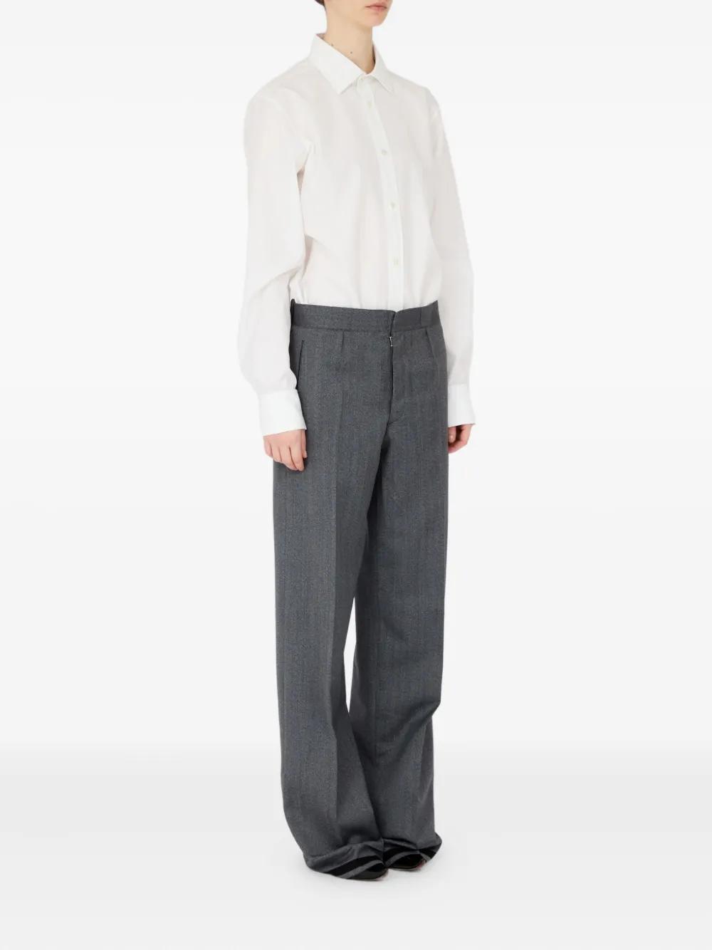 medium grey concealed front fastening two side inset pockets rear button-fastening jetted pocket long length