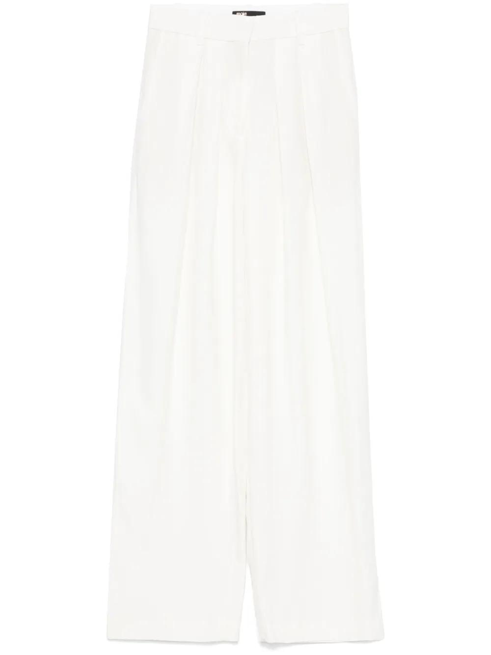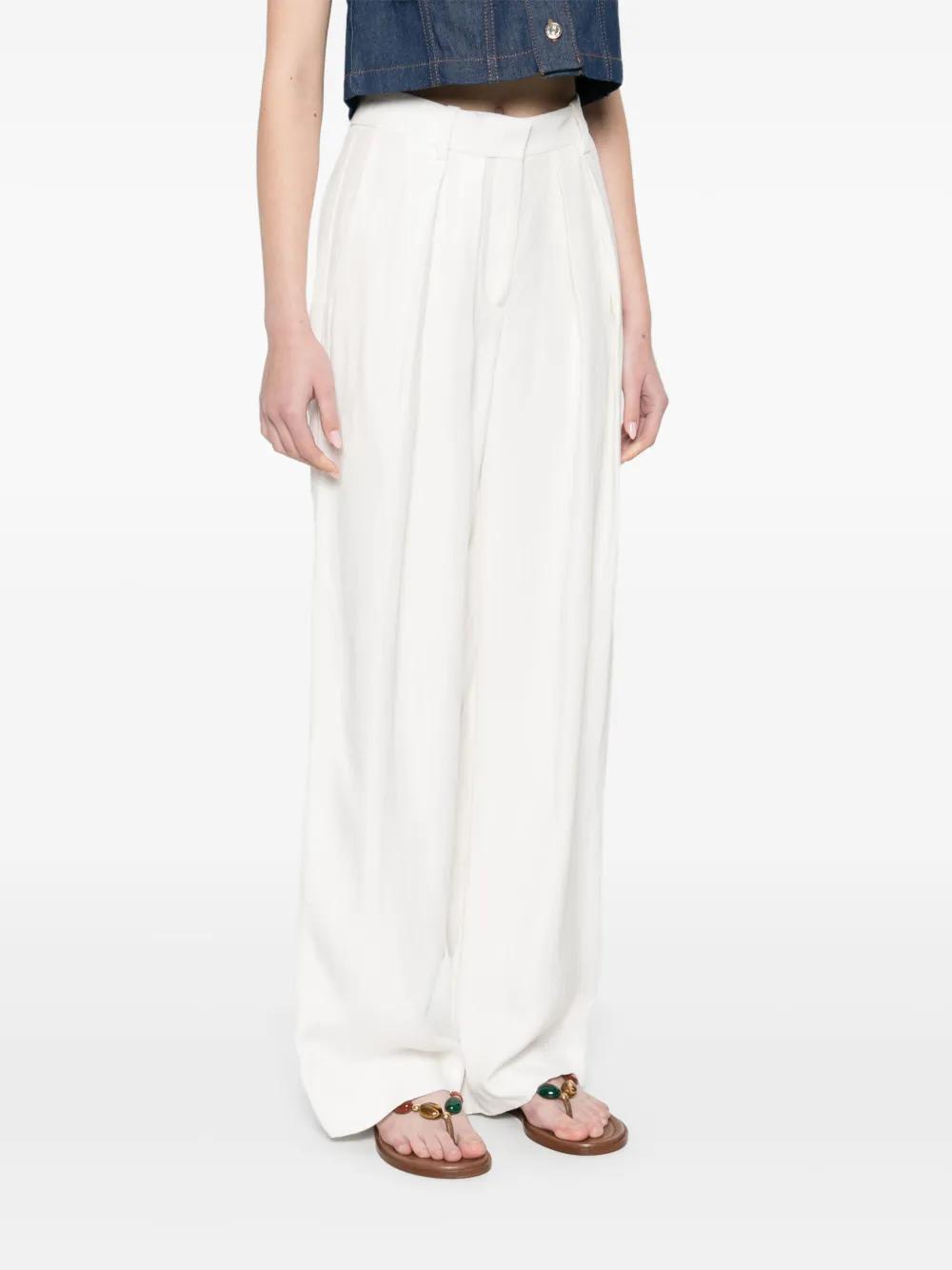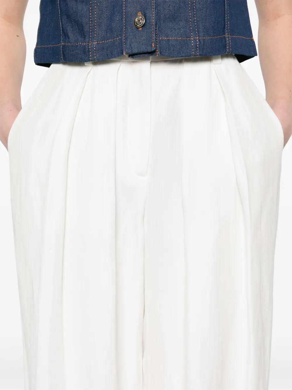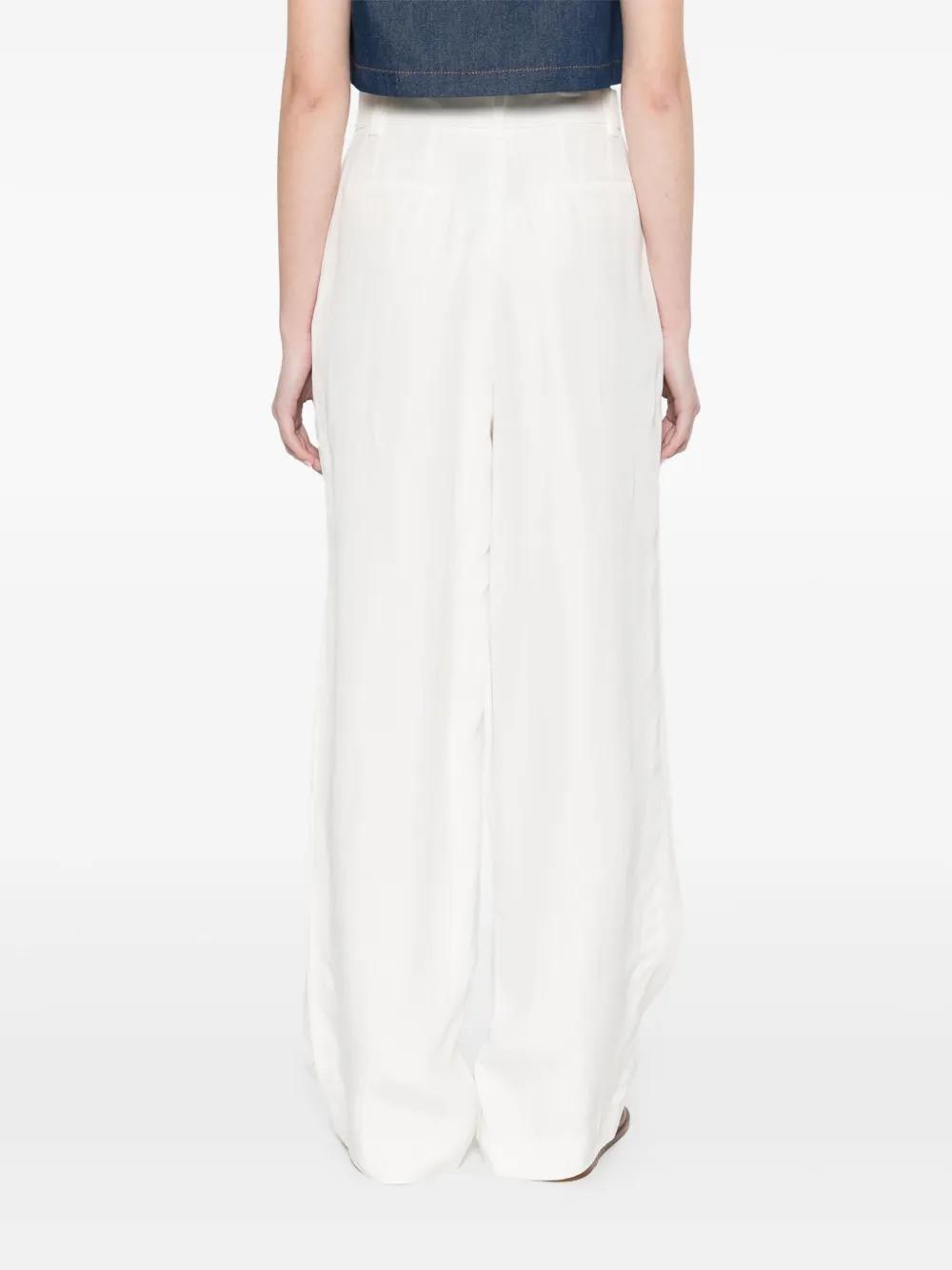 white concealed front button, hook and zip fastening belt loops two side slash pockets two rear welt pockets