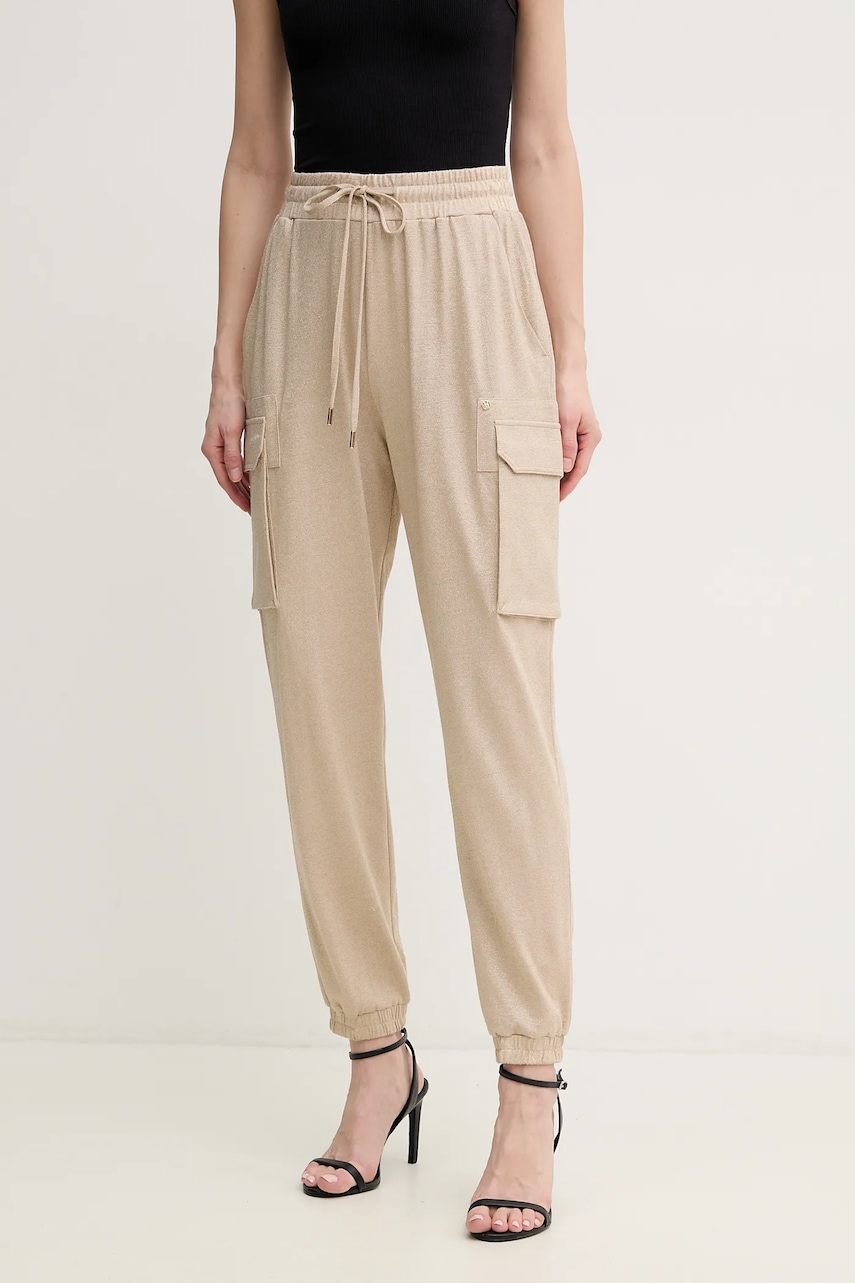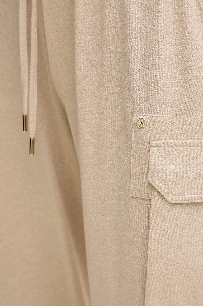 - Podwyższony stan z elastyczną listwą w pasie. - W pasie troczki. - Z przodu dwie wsuwane kieszenie. - Kieszenie typu cargo zapewniają dodatkową przestrzeń do przechowywania drobnych przedmiotów. - Fason ze zwężanymi nogawkami, które nie blokują ruchów. - Nogawki wykończone wygodnymi, elastycznymi ściągaczami. - Materiał z metaliczną nicią.