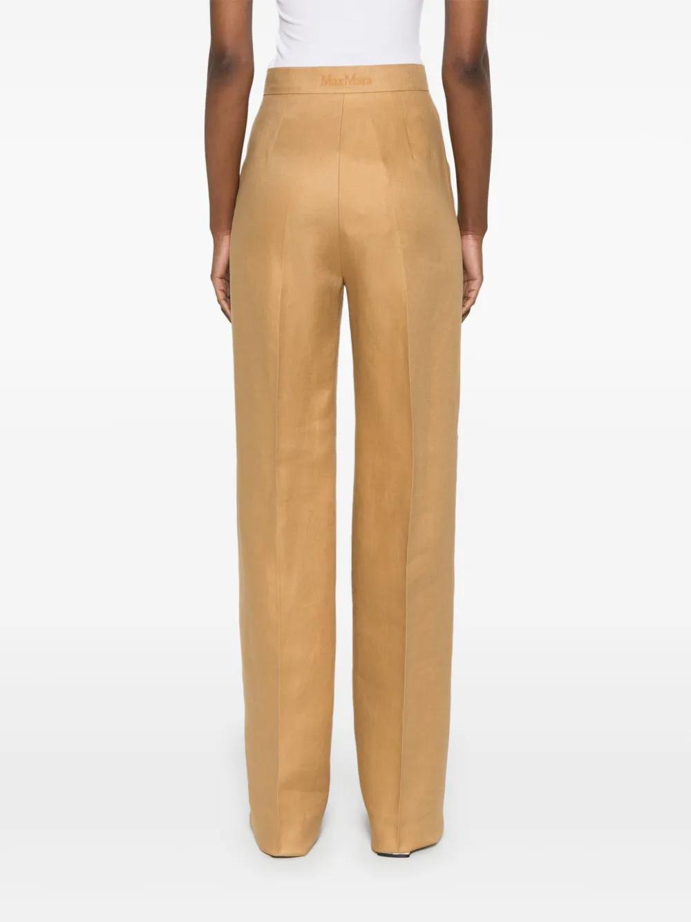 camel brown concealed front fastening two side slit pockets pressed crease embroidered logo to the rear