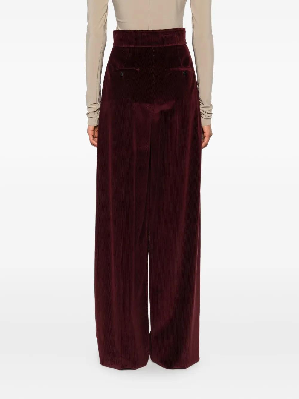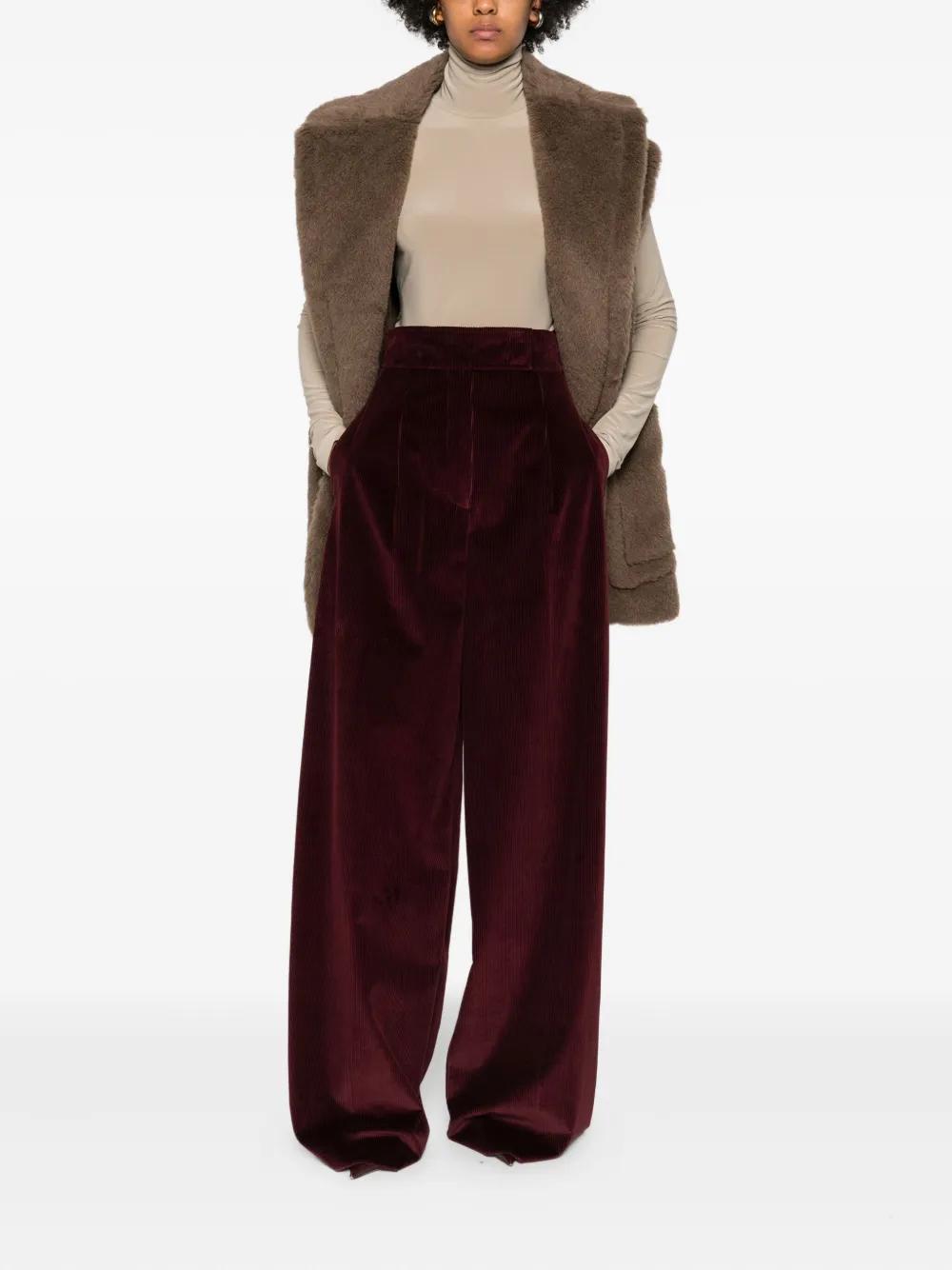 cherry red corduroy texture centre-front pleats concealed zip fly