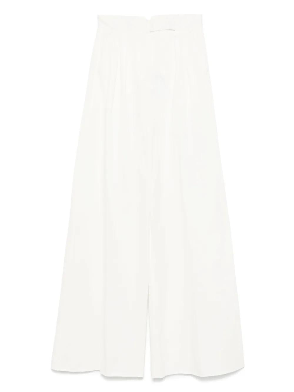 white concealed front fastening two diagonal pockets to the sides two rear welt pockets pleat detailing