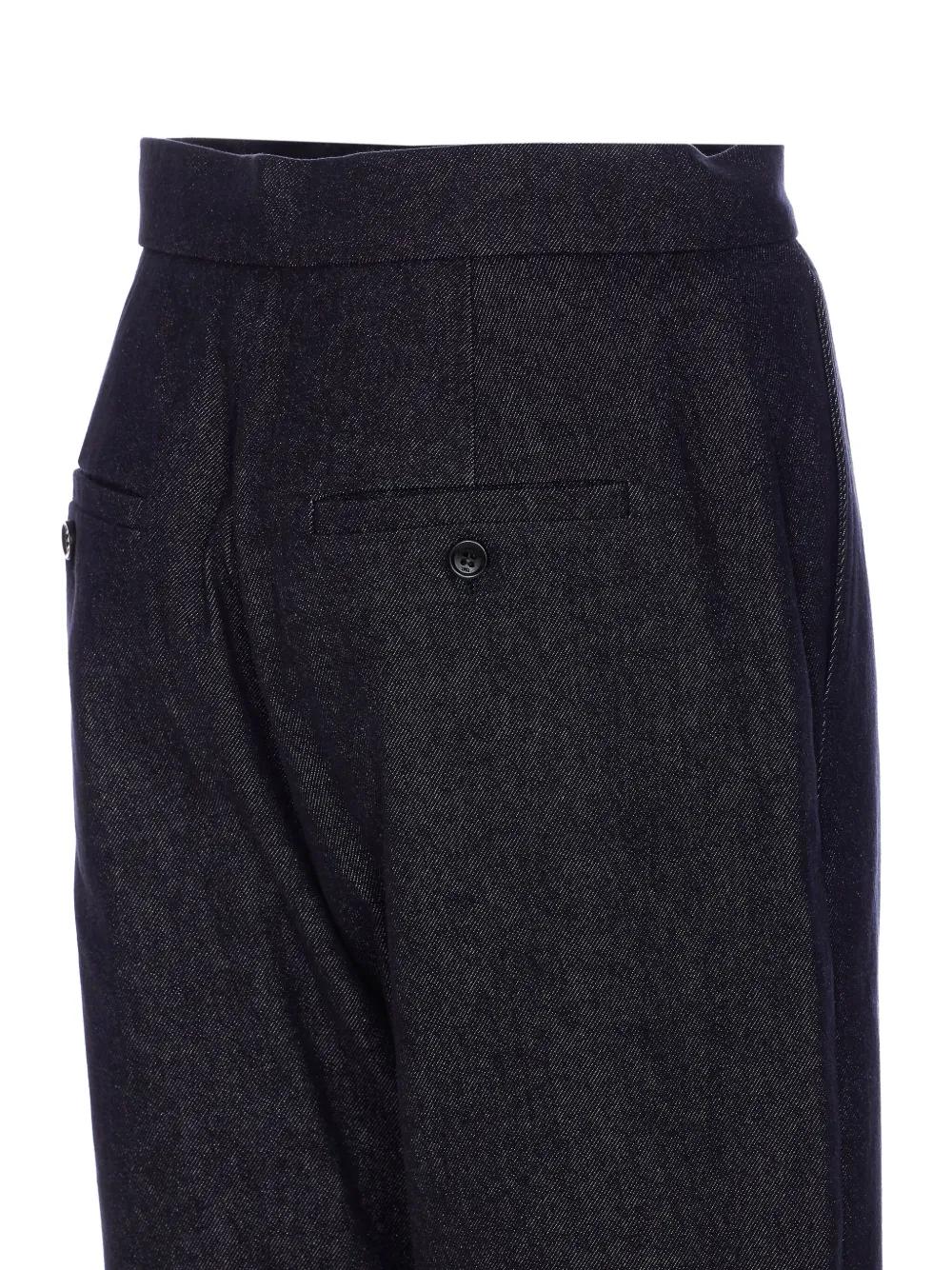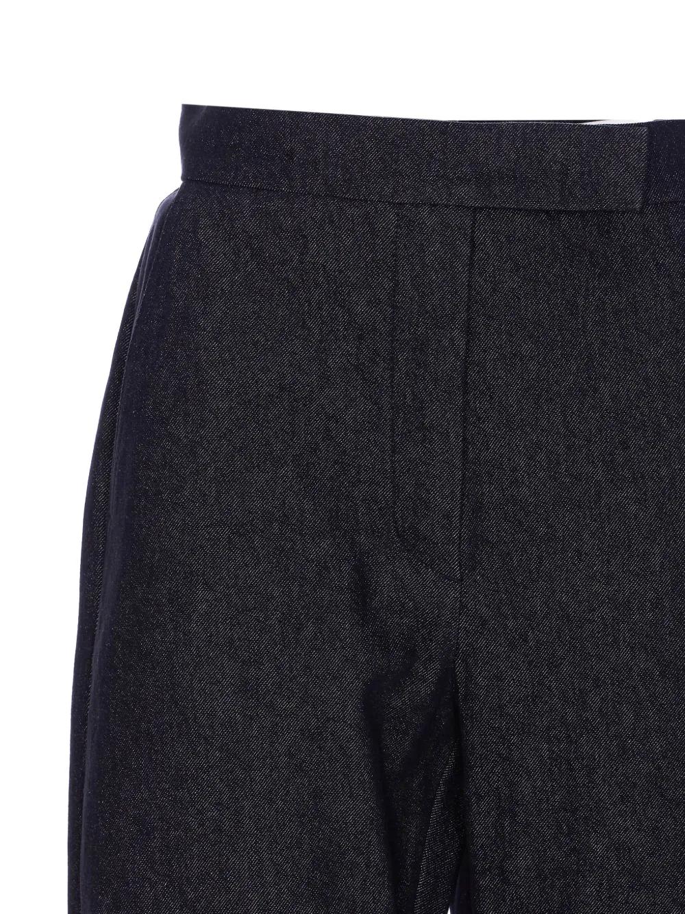 indigo blue concealed front fastening two side slash pockets two rear button-fastening jetted pockets flared