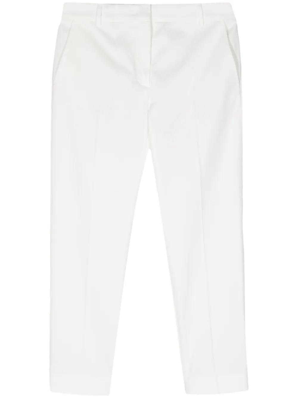 white cotton blend interlock twill weave pressed crease mid-rise belt loops concealed front fastening two side slit pockets two rear welt pockets tapered leg cropped leg