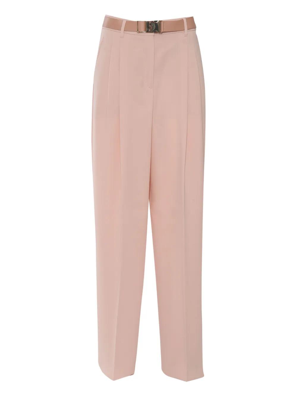 pink pleated details beige belt belt loops gold-tone buckle slash pockets