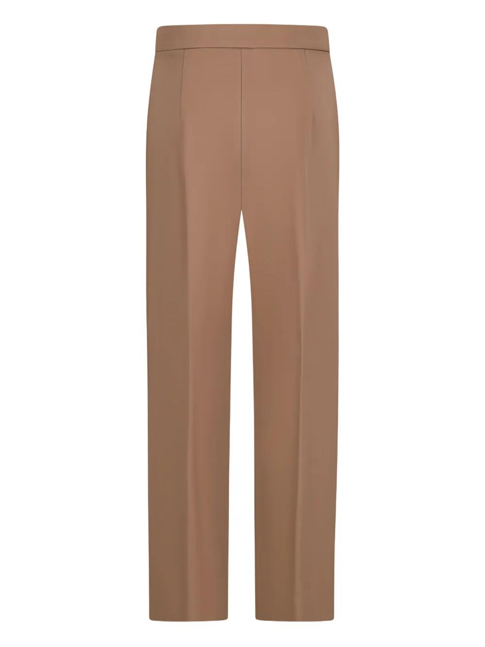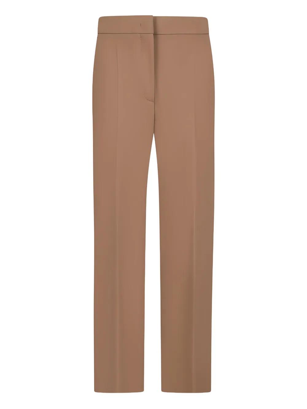 coffee brown concealed front button, hook and zip fastening two side slit pockets two rear welt pockets straight leg