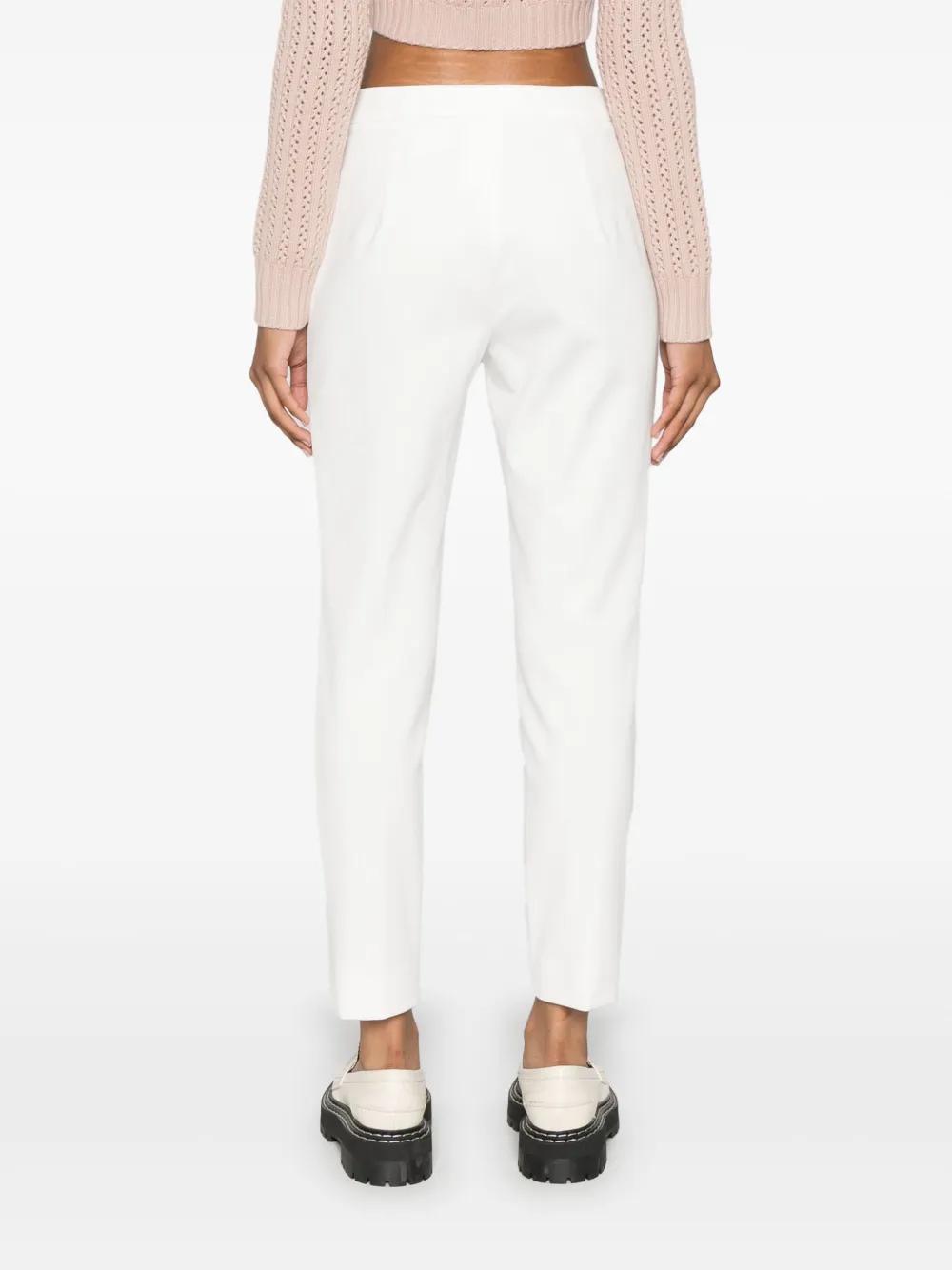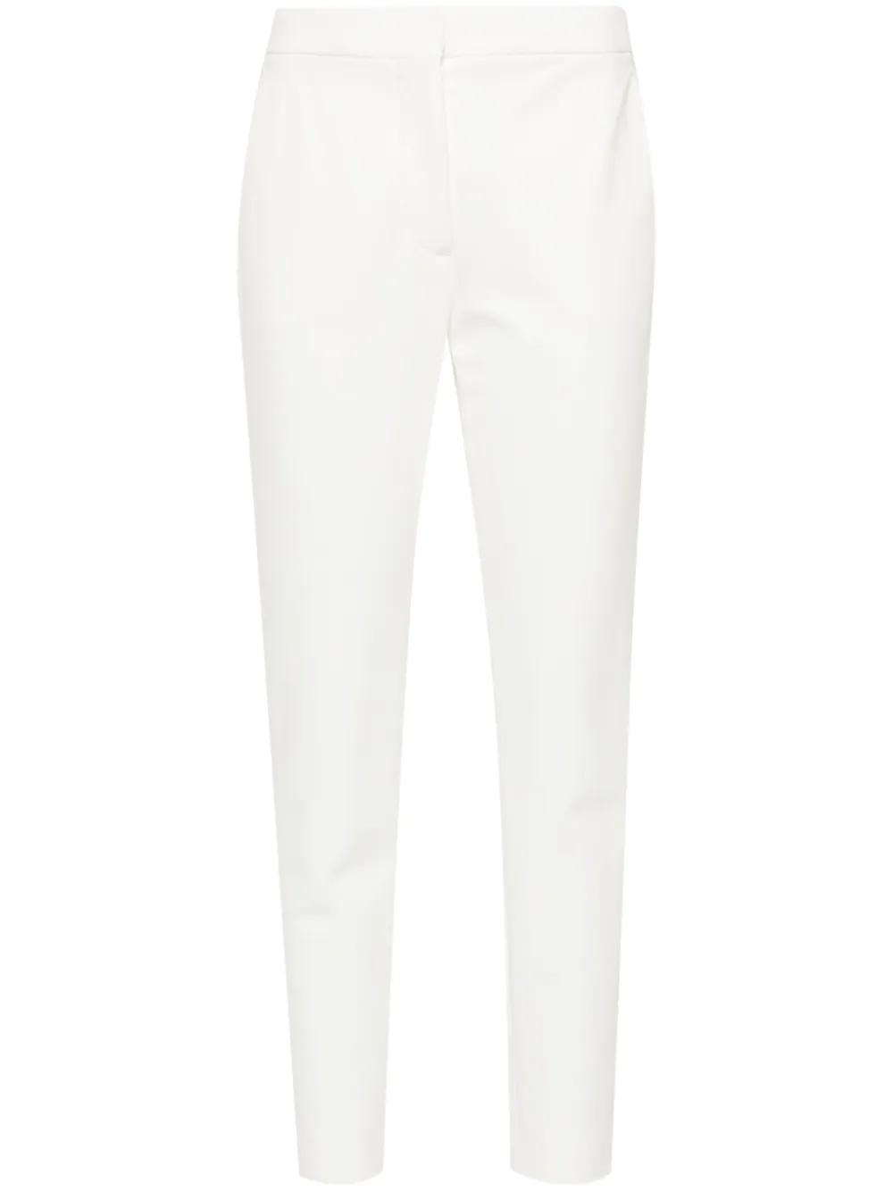 white stretch-design jersey texture concealed front button, hook and zip fastening two diagonal pockets to the sides pressed crease tapered leg