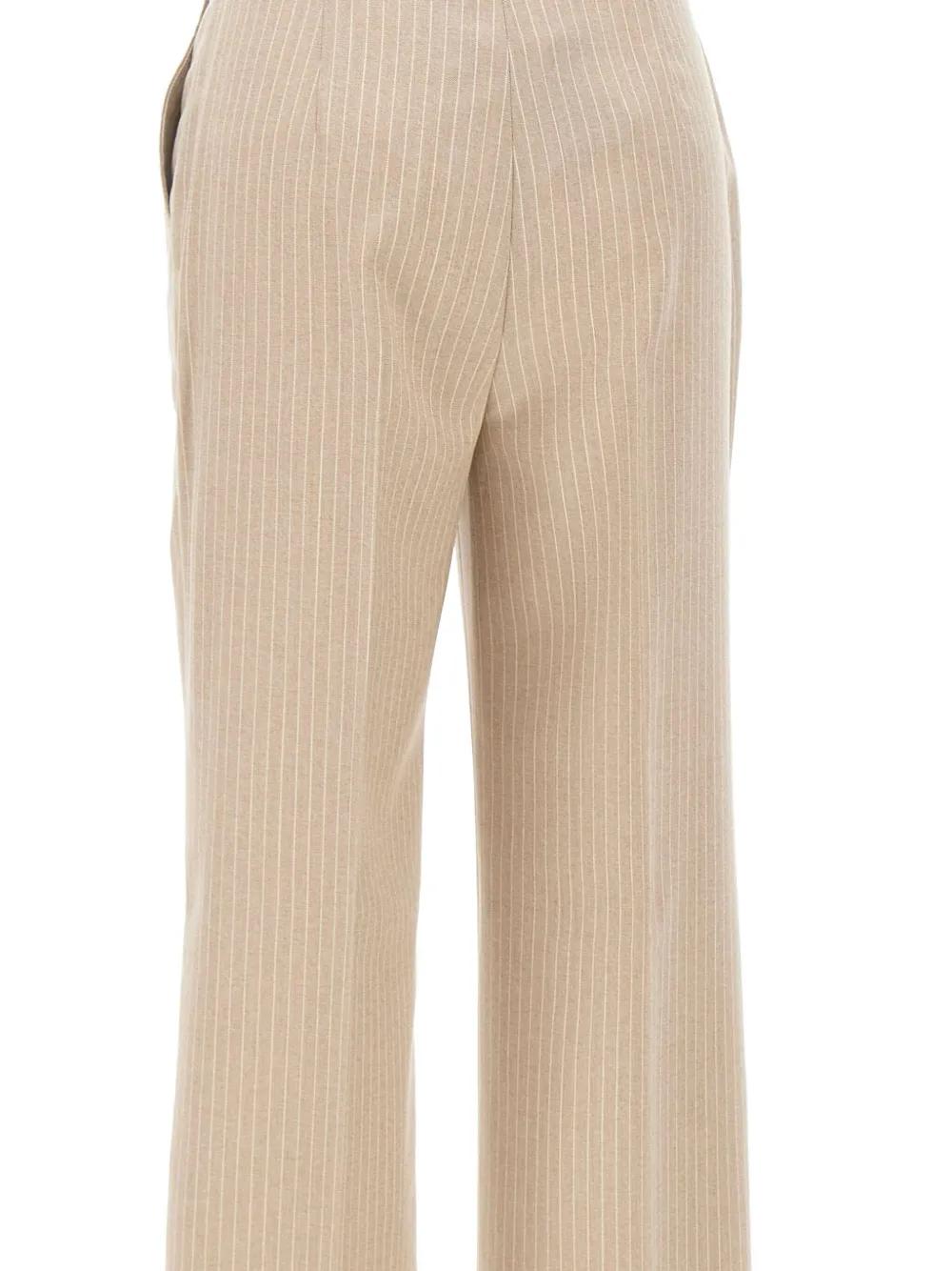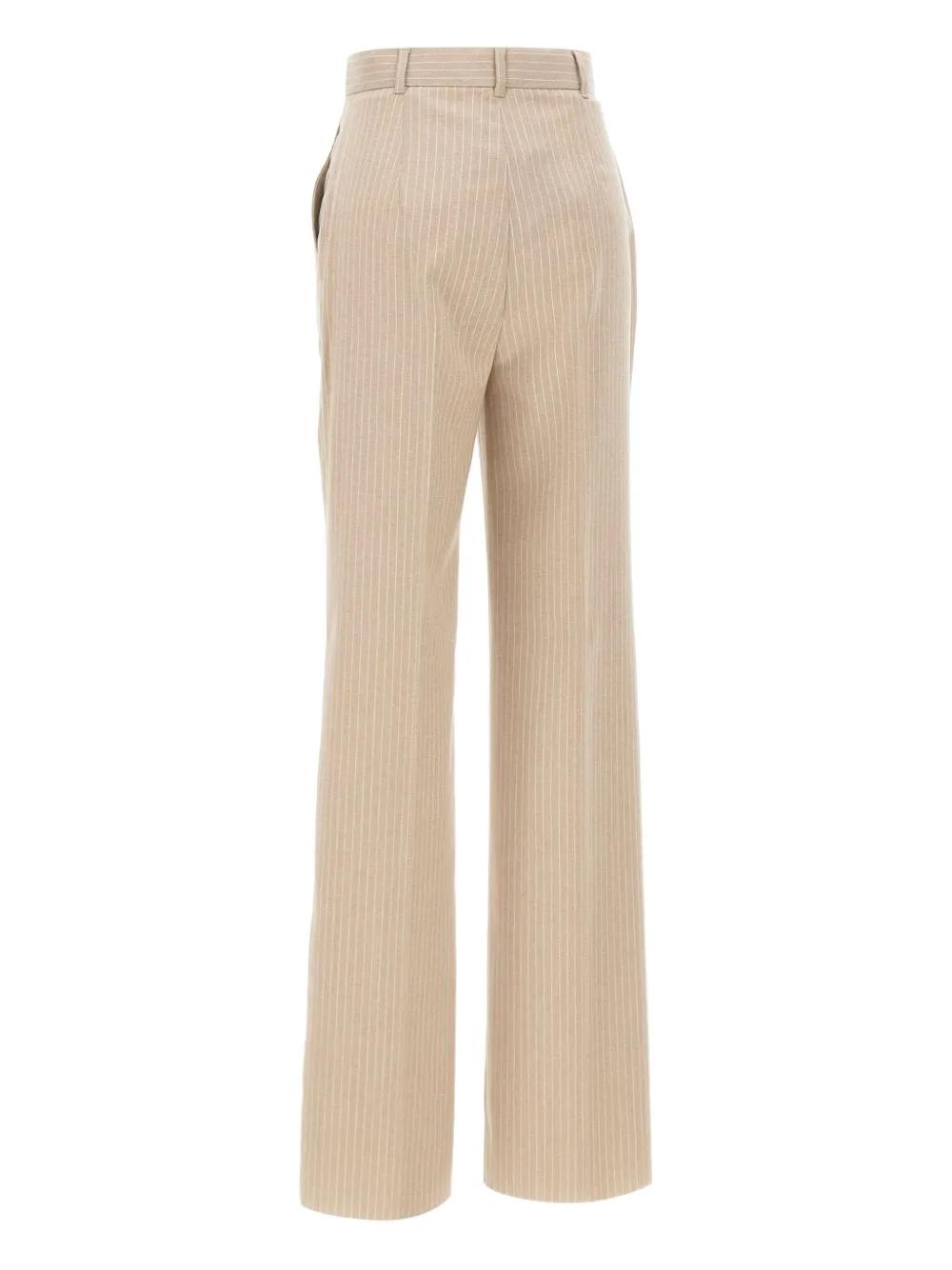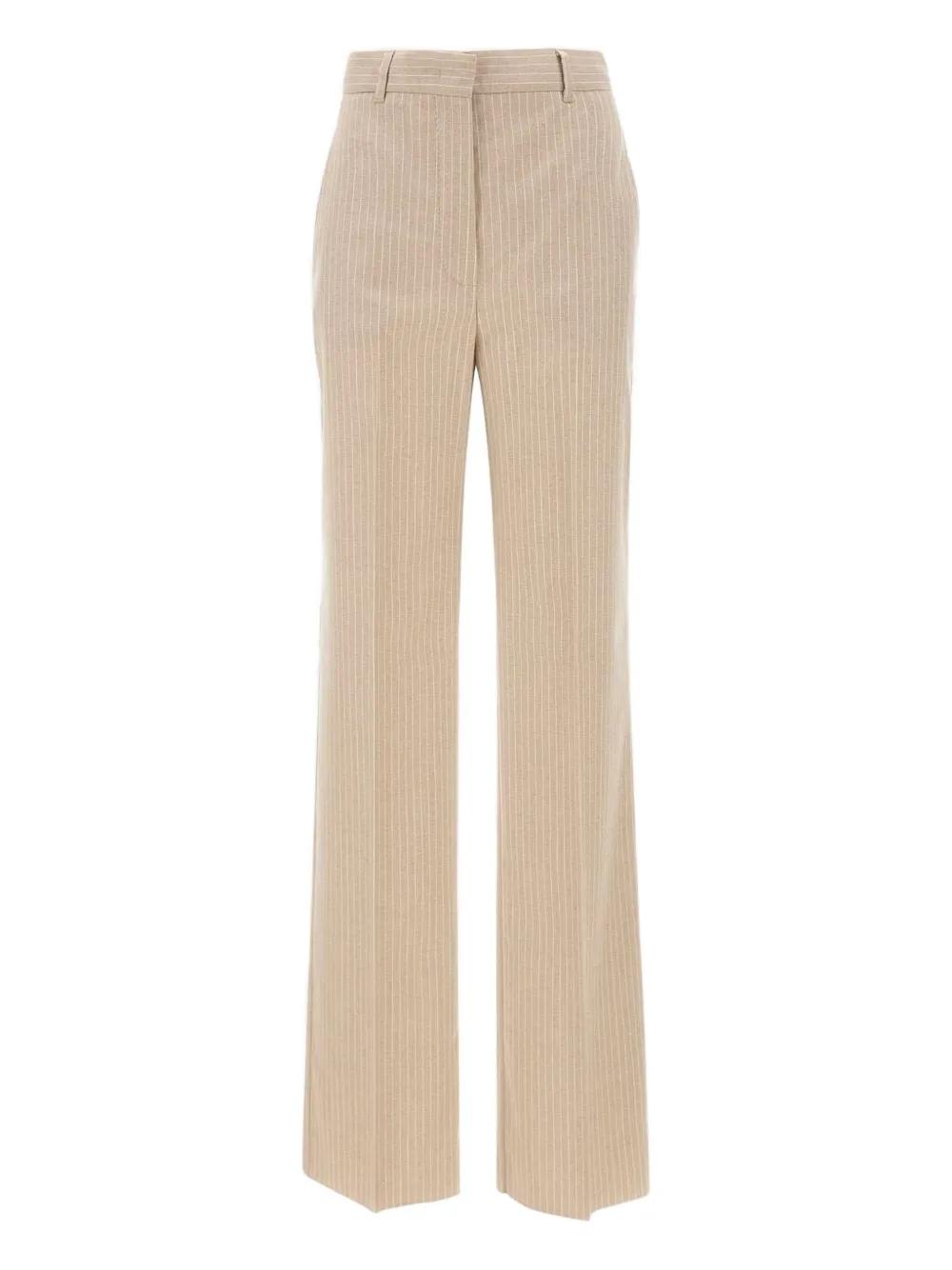 beige pinstripe pattern side slant pockets pressed pleats concealed fly